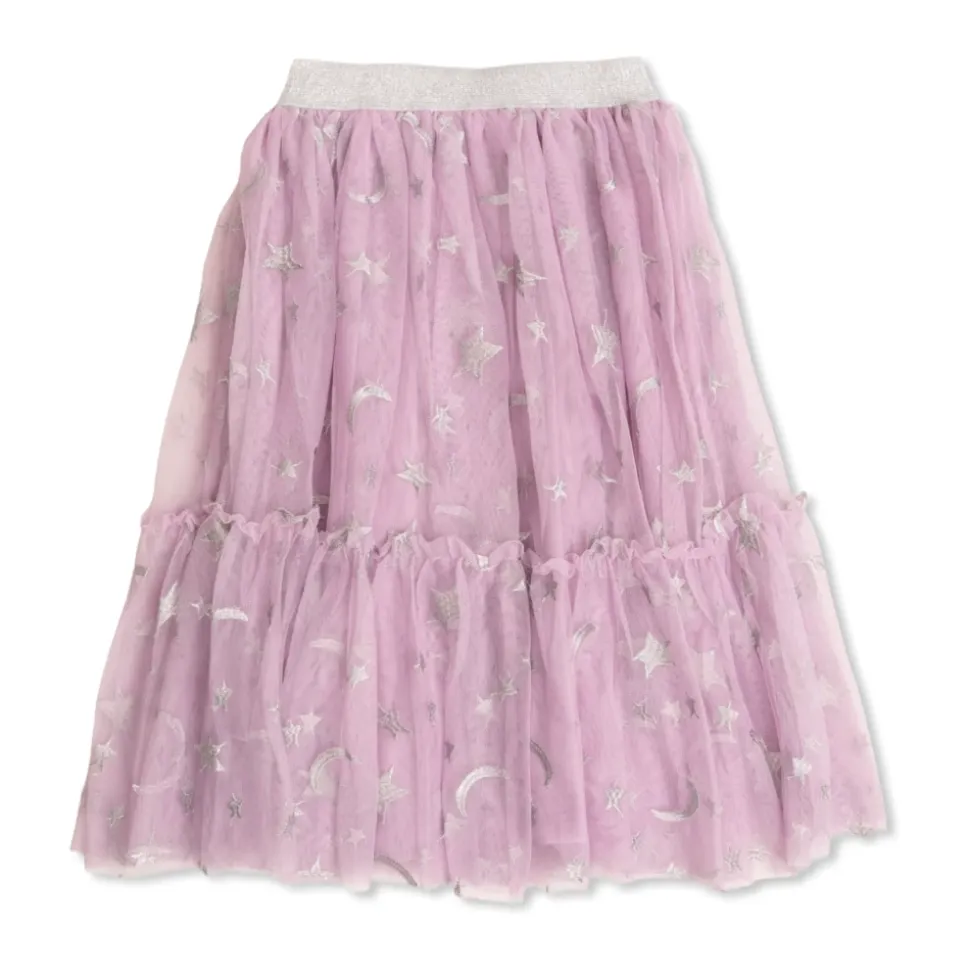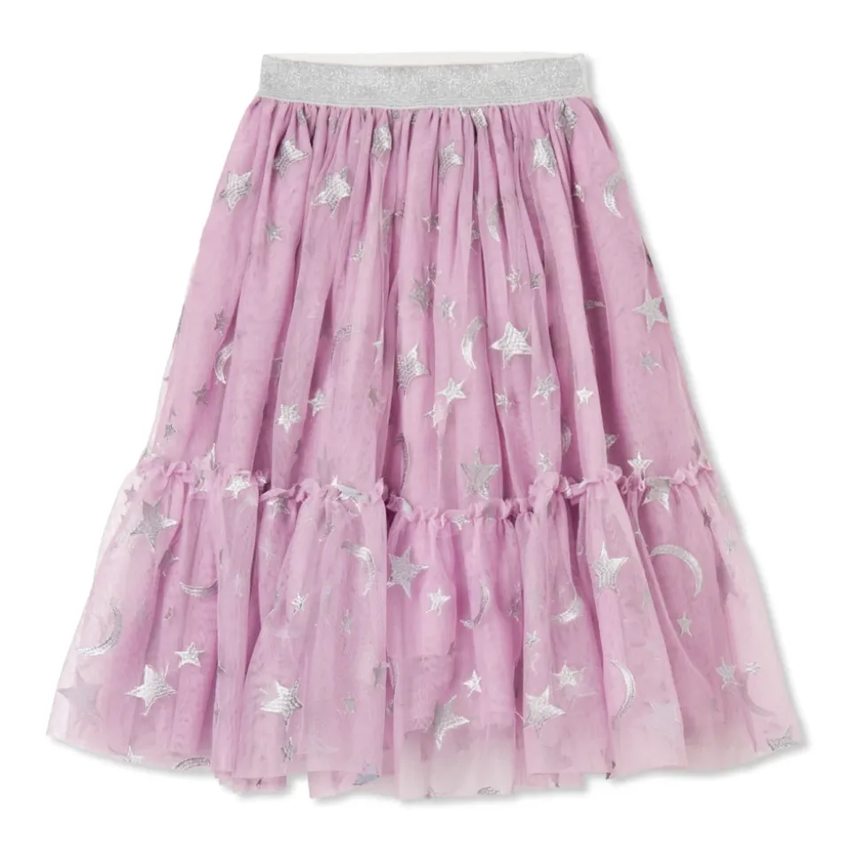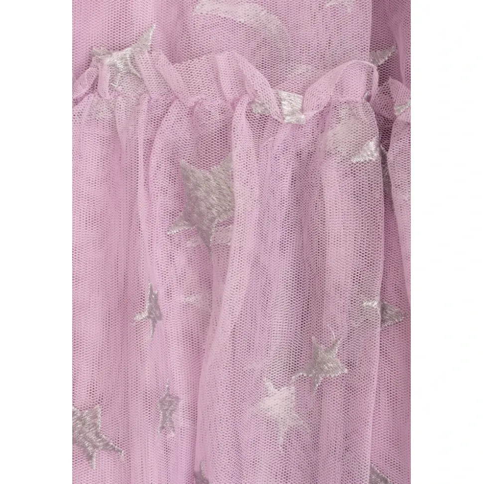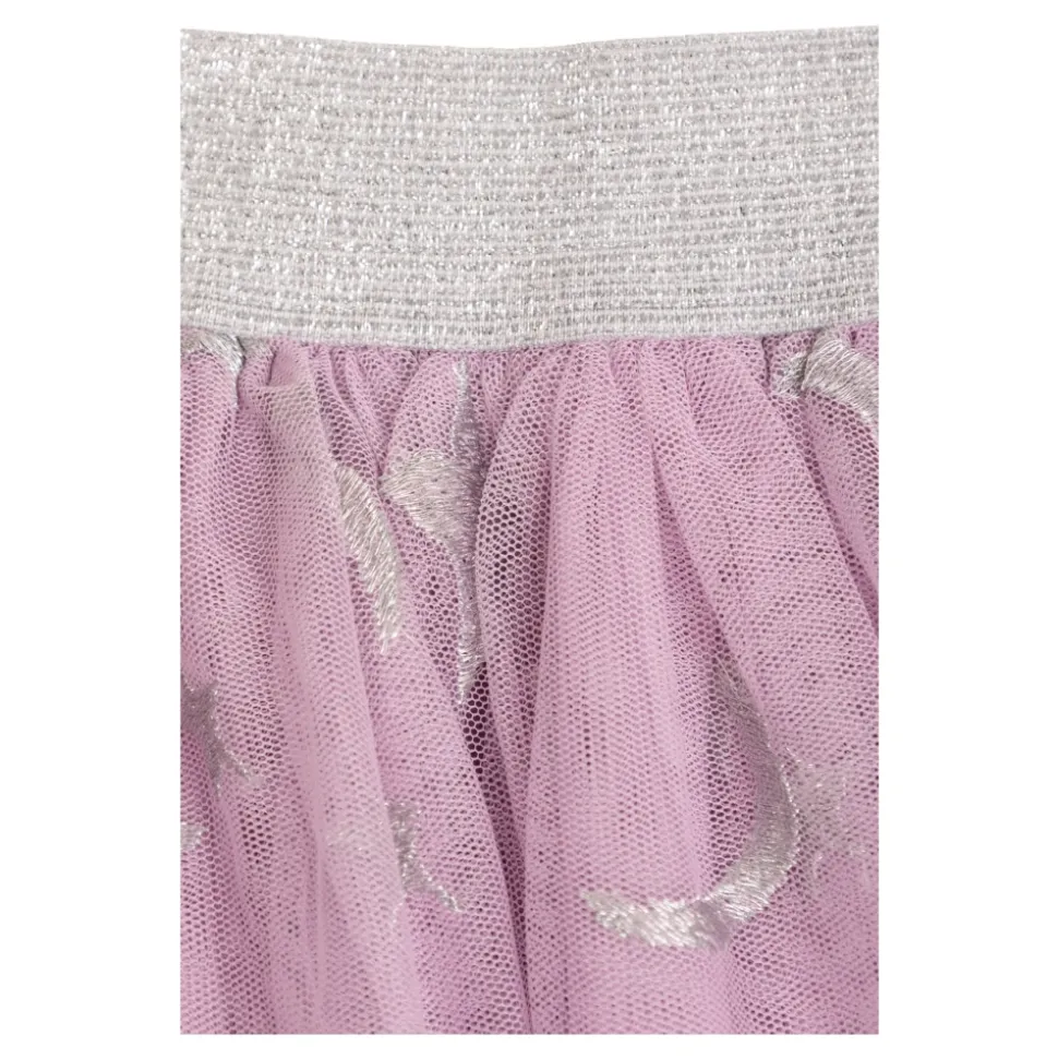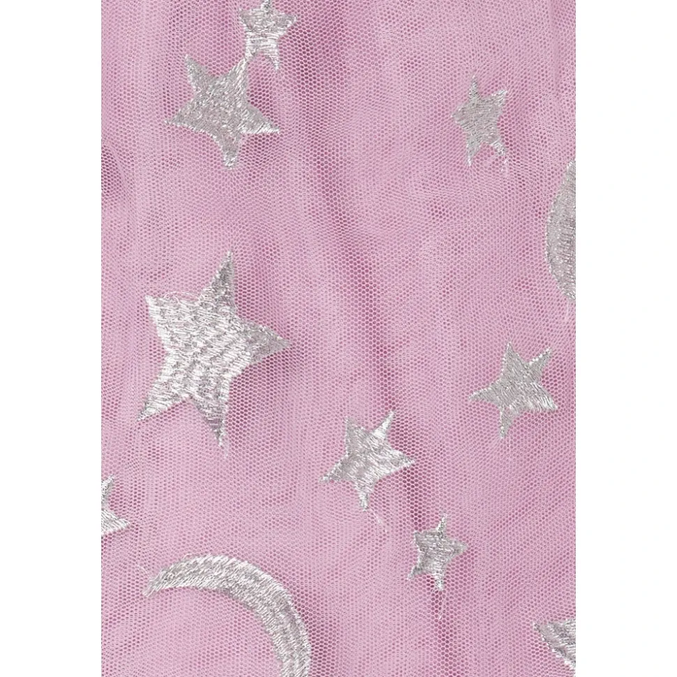 TULLE NEDERDEL fra STELLA MCCARTNEY KIDS udstråler den raffinerede elegance i børnemoden. Den svungne skæring af nederdelen, baseret på to lag gathering, giver silhuetten lethed og charme samtidig med at sikre bevægelsesfrihed. Den fint vævede, transparente tylmesh, under hvilken der ligger en delikat foring, omslutter figuren i en subtil lyserød farve, skaber en exceptionelt piget accent. Hele looket suppleres af sølvfarvet stjerne- og måneformet broderi, der fanger øjet og giver outfittet en unik charme. Den brede, elastiske talje i en sølvfarvet nuance skaber en effektiv kontrast med tyllet, hvilket garanterer komfort og en perfekt pasform i taljen. HVORFOR KØBE DETTE PRODUKT? * Et eksklusivt tilbud fra det anerkendte mærke Stella McCartney Kids * Unikt, rigt dekoreret motiv af broderede stjerner og måner * Behagelig at have på takket være den lette tyl og praktisk foring * Elegant, svungen skæring der sikrer frihed og komfort * Det perfekte valg til særlige lejligheder såvel som hverdagsoutfits