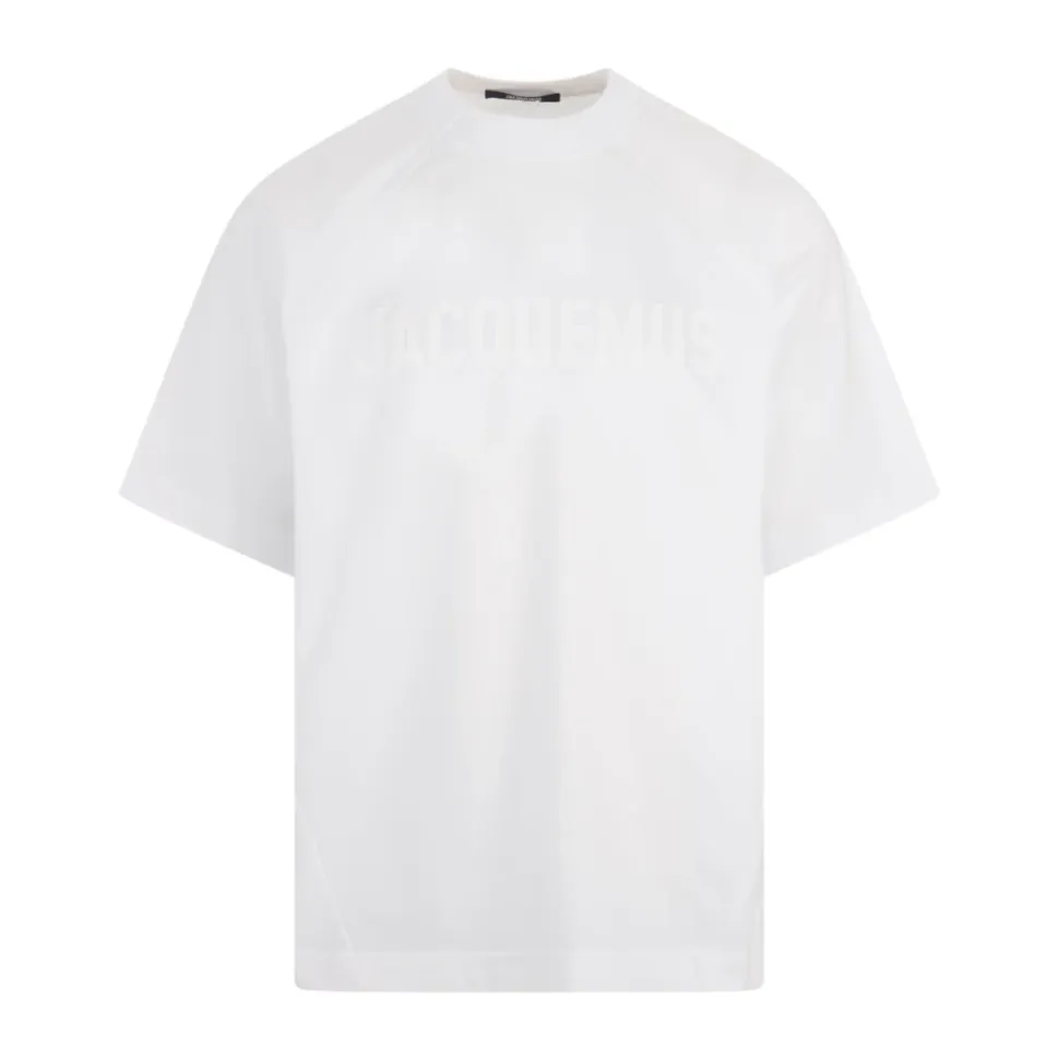 Forkæl din afslappede stil med denne hvide Jacquemus ‘The Typo’ t-shirt. Lavet af 90% bomuld og 10% elastan, den har en klassisk delvist ribbet rund halsudskæring, lige kant, albuelange raglanærmer og en tonal logo på brystet. Den afslappede pasform tilføjer et moderne touch til dette garderobestykke til mænd.