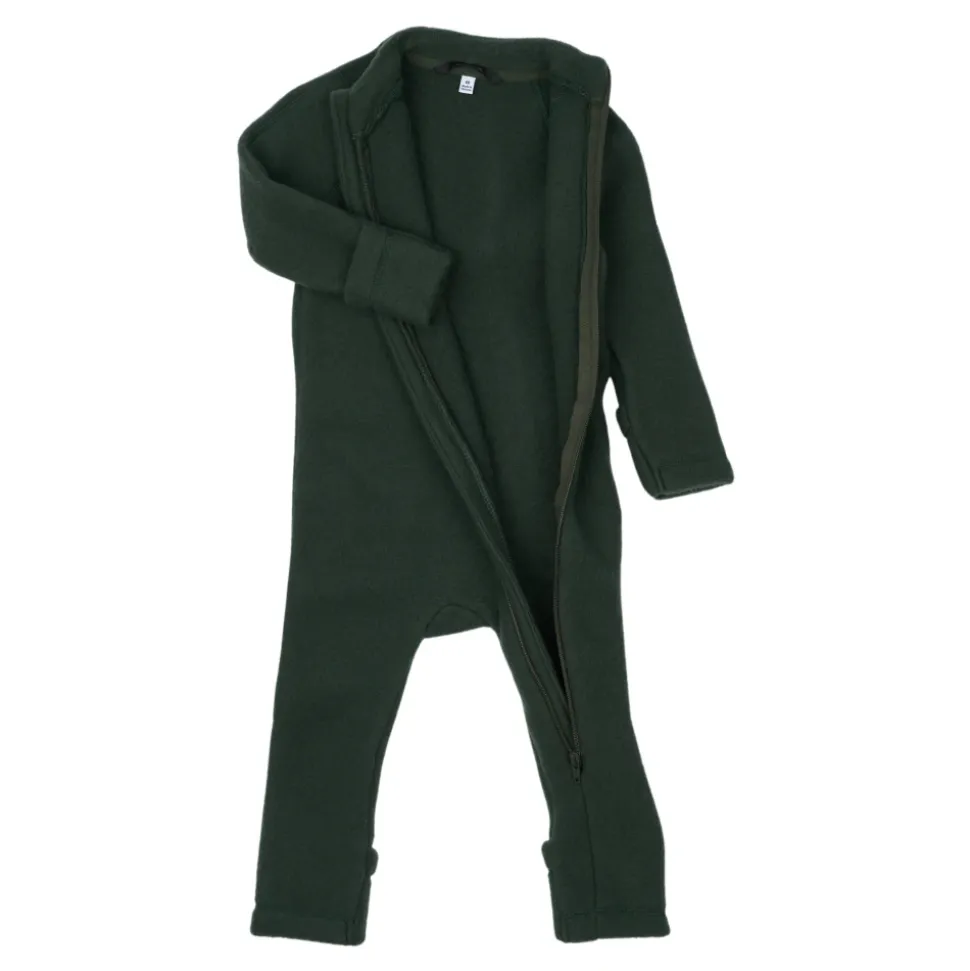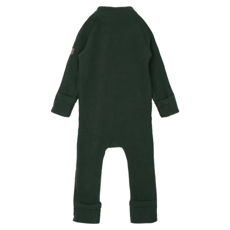 Mikk-Line – Ulddragt til baby, 50005ML – Duffel Bag. En lækker ulddragt i mørkegrøn fra danske Mikk-Line. Lavet af tyk merinouldsfleece, denne dragt har en lille krave, lange ærmer og ben med ombuk til hænder og fødder. Den har en asymmetrisk lynlås for nem påklædning og er designet til varme og komfort. Perfekt til at holde din lille varm på kolde dage. Materiale: 95% uld, 5% polyester. Oeko-Tex Standard 100 certificeret. Pleje: Maskinvask ved 30 grader på uldprogram, anbefales at vaske med vrangen ud. Styl nr.: 50005ML_Duffel Bag.