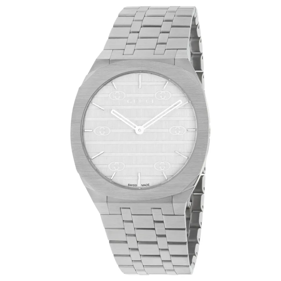Forhøj din stil med dette fantastiske Gucci-ur til kvinder. Med en sølvskive, rustfrit stålkasse, 38 mm diameter, 3 ATM vandtæthed, safirglas, rustfrit stålrem og sølvspænde.