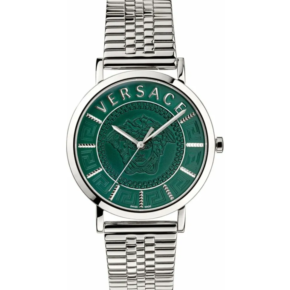 Versace V-ESSENTIAL uret kombinerer et sølvfarvet armbånd i rustfrit stål med en grøn urskive med den ikoniske Medusa-gravering. Det tilbyder præcis kvartsbevægelse og et ridsefast safirkrystal for pålidelig hverdagsbrug. Nøgleattributter: Grå | Sølv | Grøn | Rustfrit stål | Vandafvisende op til 5 ATM | Ridsefast safirkrystal | Armbånd i rustfrit stål med trykknapslås | Kvartsbevægelse for præcis tidtagning | Grøn urskive med Medusa-gravering | Sølvfarvet urkasse og armbånd | Rund urkasseform | Dimensioner og pasform: Urkassediameter: 40 mm
