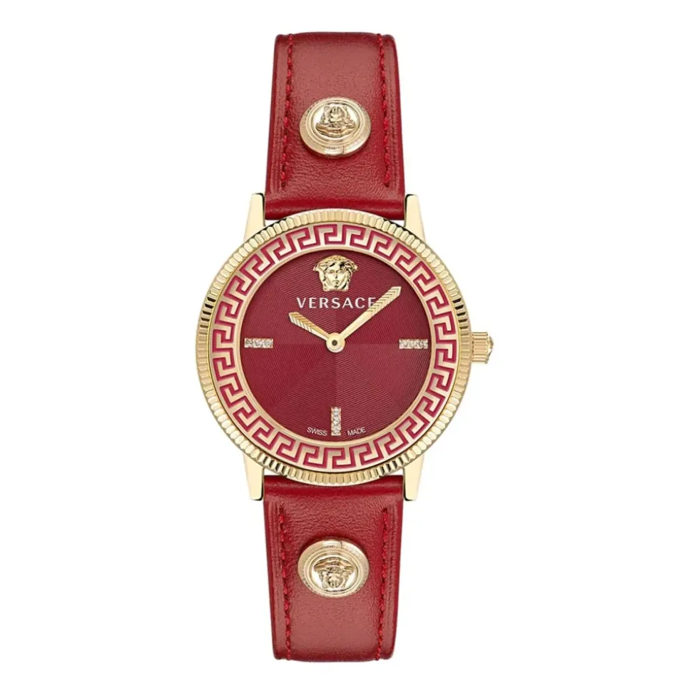 Forhøj din stil med Versace VE2P00722 V-Tribute dameur. Dette fantastiske 36 mm ur har en schweizisk kvartsbevægelse, en guld rustfrit stål kasse med zirkonia pynt og et rødt læderrem med foldeslås. Vandafvisende op til 5 ATM, dette ur er både elegant og funktionelt, perfekt til den moderne kvinde.