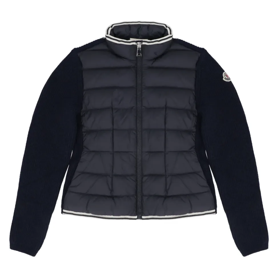 Moncler vatteret cardigan med lynlås i bomuld kombinerer en strikket ryg og ærmer med et dunfyldt frontpanel for letvægtsisolering. Den er designet som et lag-på-lag stykke i bomberjakkeform med lynlåslukning og praktiske lommer. Nøgleattributter: Marineblå | Bomuld | Dunfyldt front for isolering | Letvægtsvarme | Lynlåslukning | Paspolerede forlommer | Ribstrikket krave, manchetter og kant | Rullekrave | Bomberjakkeformet silhuet | Stribet kant | Glatstrik på ryg og ærmer | Vatteret frontpanel | Sammensætning & pleje: Yderstof foran: 100% polyester | Basismateriale: 100% bomuld | For: 100% polyester | Fyld: 90% dun, 10% fjer | Detaljer fyld: 100% polyester | Håndvask; Må ikke bleges; Må ikke tørretumbles; Stryges ved maks. 110°C uden d Må ikke renses; Flad tørring i skyggen.