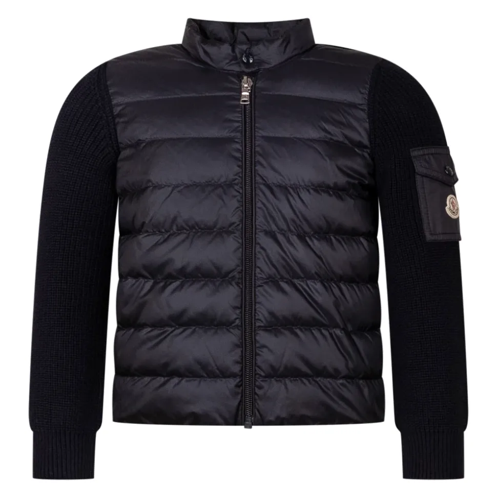 Moncler vatteret cardigan med lynlås i bomuld kombinerer blød strik med en dunforet front for at give let isolering og behagelig varme. Vigtige egenskaber: Marineblå | Bomuld | Isolerende dunforet front | Mellemvægt strik for let varme | Lynlåslukning | Ærmelomme | Ribstrikket krave, manchetter og kant | Gauge 7 mellemvægt strik | Dunforet nylonfront | Sammensætning og pleje: Basiskvalitet: 100% bomuld | Yderstof front: 100% polyamid (nylon) | Krave: 100% polyamid (nylon) | Frontfor: 100% bomuld | Kravefor: 100% polyamid (nylon) | Vattering: 90% dun, 10% fjer | Detaljer vattering: 100% polyester | Håndvask; Må ikke bleges; Må ikke tørretumbles; Stryges ved max 110°C uden d Må ikke renses; Må ikke professionelt vådrenses; Tørres fladt i skyggen.