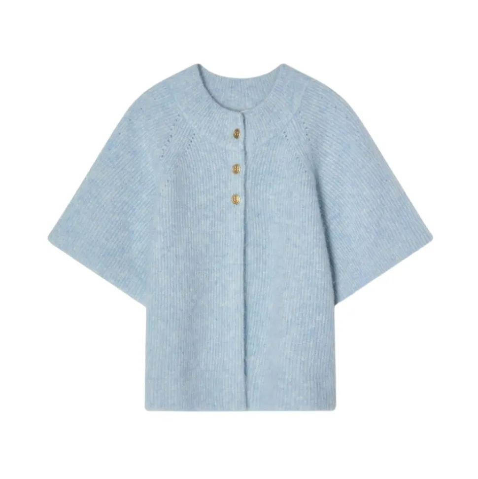 Busnels Vilanie kortærmede Mohair Cardigan er en cape-inspireret strik, der kombinerer en blød, fluffy mohair-uldtekstur med en skulpturel silhuet. Den er designet til nem lagdeling og til at tilføje et raffineret, feminint touch til outfits. Vigtigste egenskaber: Blå | Isblå | Mohair og uld | Topknaplukning | Kan lagdeles over oversized skjorter | Cape-inspireret silhuet | Rund halsudskæring | Korte flæseærmer | Fluffy, blød tekstur | Tre gyldne B-knapper foroven | Mål og pasform: Normal i størrelsen | Modellen er 175 cm høj og bærer størrelse 38 | Sammensætning og pleje: 33% mohair, 33% uld, 28% nylon, 6% elastan | Håndvask