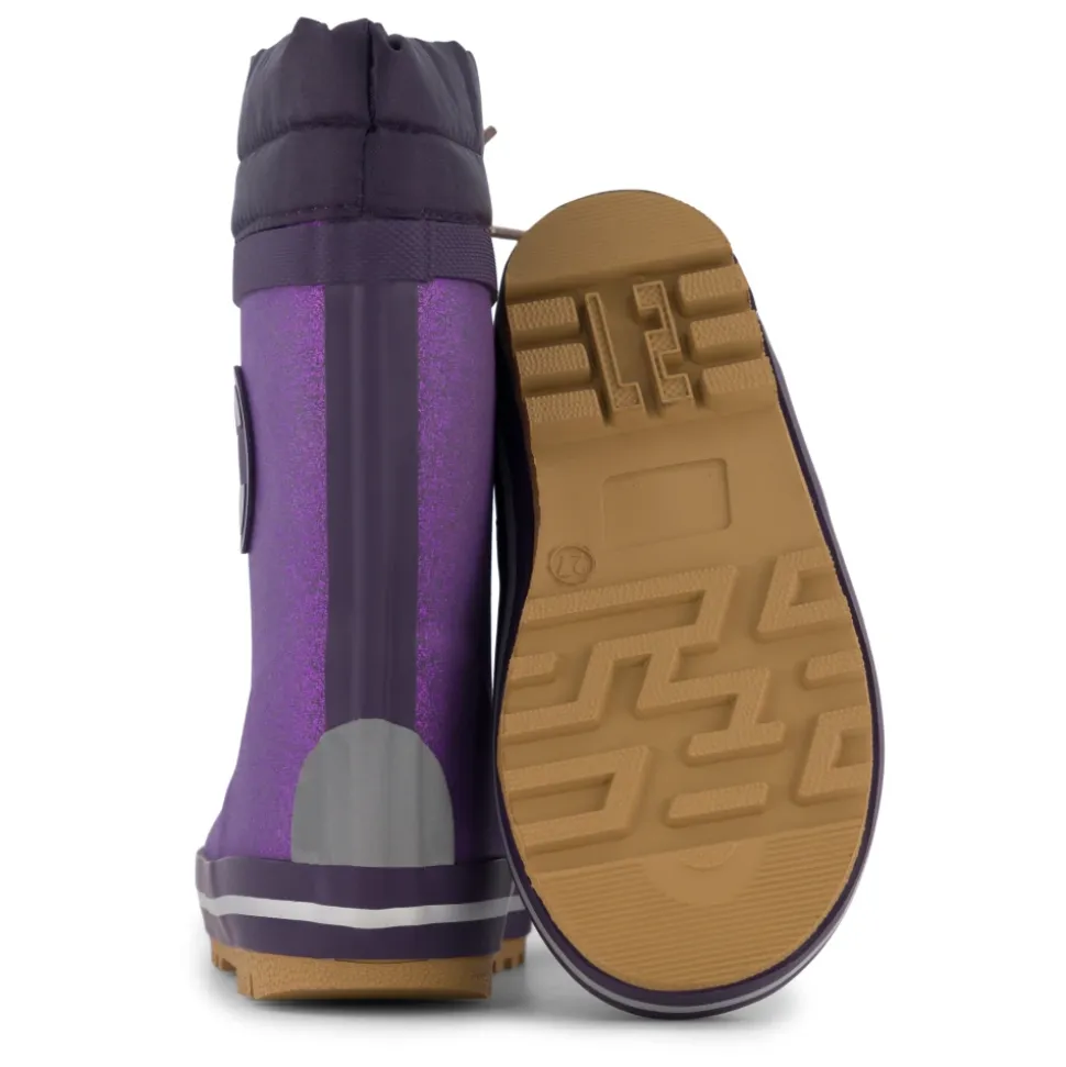 Mikk-Line – Winter Wellies Glitter, 38050 – Nightshade Varme vintergummistøvler med blødt uldfoer fra danske Mikk-Line.Denne i en flot mørk blomme farve med lilla glitter over det hele, lysebrune snøre samt øverst del af skaftet i mørk blomme tekstil.I bunden af gummistøvsugerne er der en blød og udtagelig sål.Gummistøverne er vandtætte og holder dit barns fødder tørre og rene hele dagen lang. De er desuden forsynet med refleks detaljer, der gør barnet synligt i mørket.Den skridsikre sål gør det lettere for dit barn at gå på glatte overflader. Vi anbefaler et voksetillæg på ca. 1,2 cm på gummistøvler.Fordele:• Vandtætte gummistøvler• Nem at rengøre• Holder dit barns fødder tørre og rene• Refleksdetaljer, der øger sikkerheden for dit barn, når det er mørkt• Med den skridsikre sål er det nemmere for dit barn at gå på klumpet og glat underlag Materiale: 42% Natural Rubber, 2% Rubber, 44% Calcium Carbonate, 12% Other Style no.: 38050_NightshadeIndvendige mål:Str. 20: 13,1 cmStr. 21: 13,8 cmStr. 22: 14,5 cmStr. 23: 15,0 cmStr. 24: 16,0 cmStr. 25: 16,5 cmStr. 26: 17,0 cmStr. 27: 17,5 cmStr. 28: 18,5 cmStr. 29: 19,0 cmStr. 30: 20,0 cmStr. 31: 20,5 cmStr. 32: 21,0 cmMål er vejledende og kan afvige med 1-2 milimeter. Plejevejledning:- Hvis der kommer vand ind i gummistøvlerne, kan du fjerne indlægssålerne og hænge dem til tørre.- Brug en vandbaseret imprægneringsspray (helst uden PFAS) til regelmæssigt at imprægnere gummistøvlerne. Dette hjælper med at fugte gummistøvlerne og forhindre dem i at revne. Undgå at sprøjte på ydersålen, da den kan blive glat.- Rengør gummistøvlerne ofte. Brug en blød klud med vand og almindelig opvaskesæbe.- Lad gummistøvlerne tørre ved stuetemperatur. Hvis der er vand indeni støvlerne/gummistøvlerne, fyld dem med avispapir der kan suge vandet.- Undgå at udsætte gummistøvlerne for sollys og ekstremt høje eller lave temperaturer i længere perioder.- Opbevar gummistøvlerne oprejst et tørt, mørkt og køligt sted.