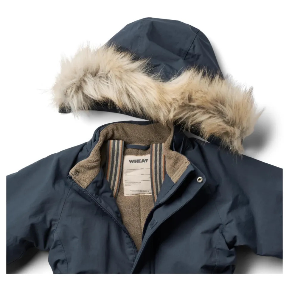 Bedstsælgende vinterdragt fra Wheat. Denne vinterdragt har alle de kvaliteter, der er nødvendige for, at børnene kan hygge sig udenfor i den kolde vintertid. Derudover har den et super lækkert design med håndtegnede print af Wheat, hvilket gør den ekstra speciel. Dragten er vandtæt med tapede sømme og slidstærk. Den har indvendige seler, så barnet kan tage dragten delvist af og have frie arme, hvis det er varmt. Meget praktisk. – Normal pasform – Foret med blød og hyggelig fleece – Elastiske seler – Aftagelig og justerbar hætte – Justeringsmulighed i taljen – Sidelommer med knapper – Justerbar gummistropp under fødder – Reflekser – Håndtegnet print – Vandtæthed 10000 – OEKO-TEX® 100 certificeret – Slidstyrke: 50.000 mm.