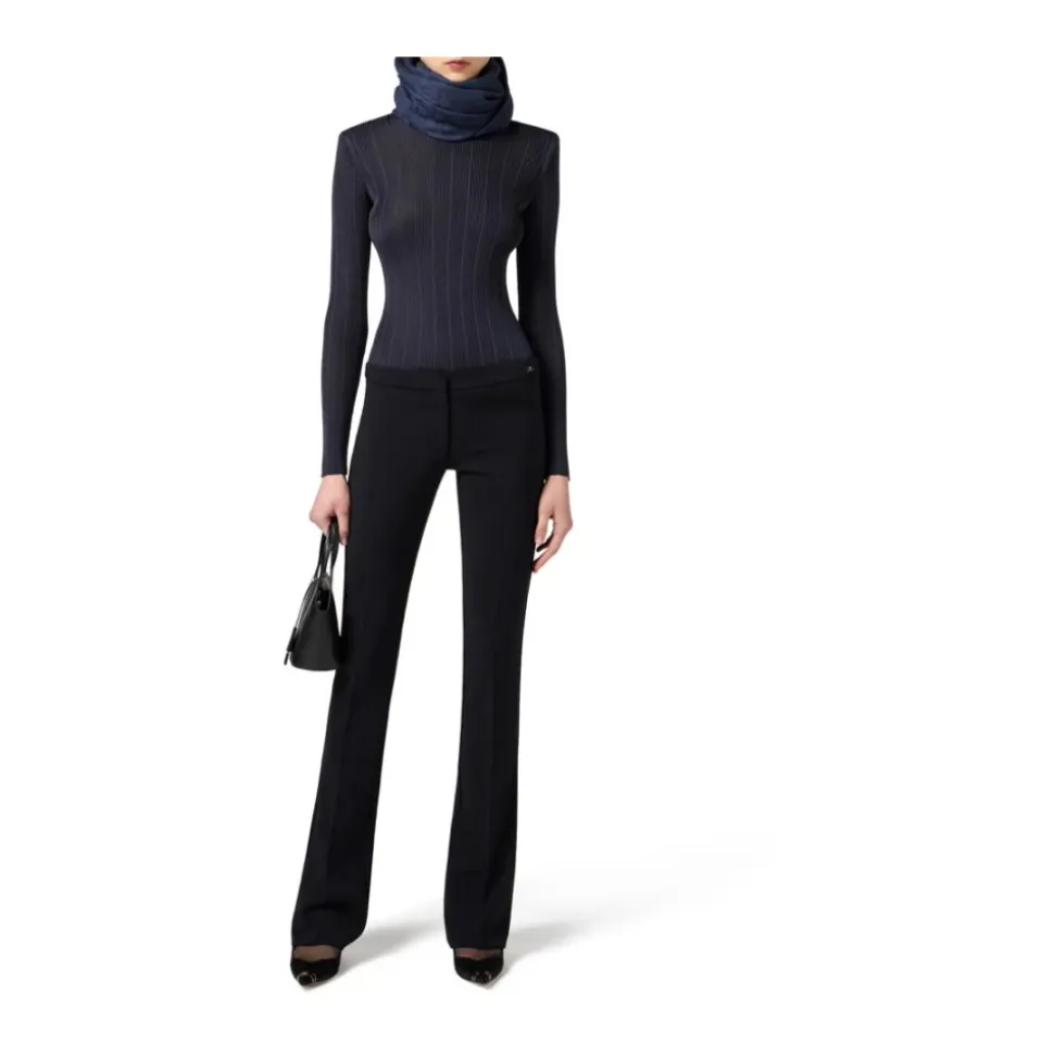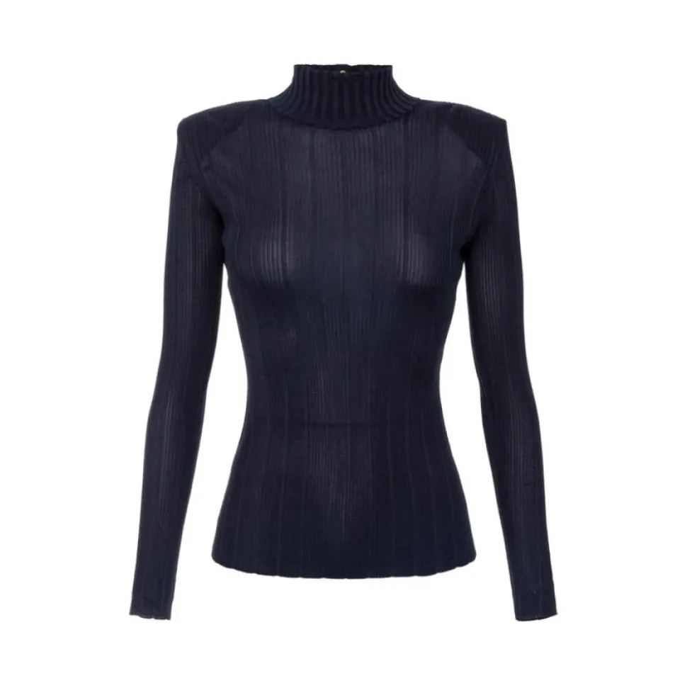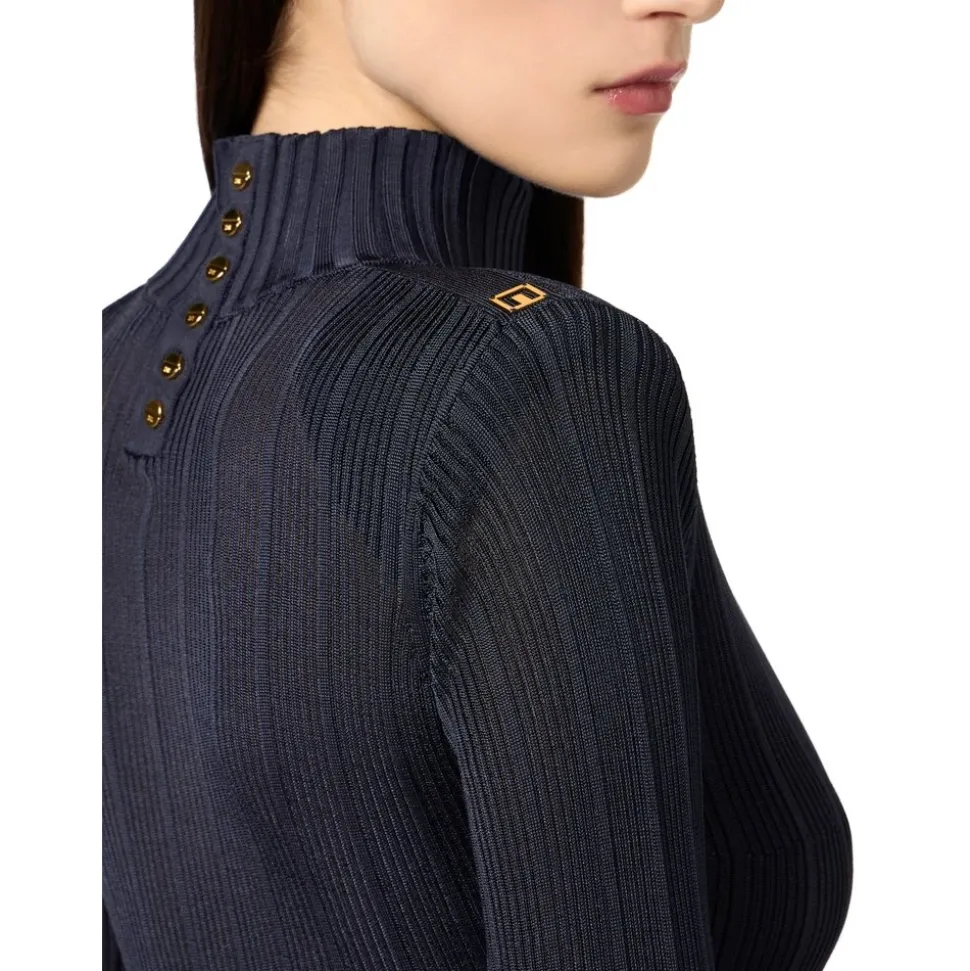 Elisabetta Franchi’s Viscose Top med logo detaljer er en slim-fit turtleneck, der kombinerer en flydende ribstrikket viskose med skulderbånd og guldfarvede logo-accenter for et poleret, elegant look. Vigtigste egenskaber: Blå | Twilight | Viskose | Høj krave (turtleneck) | Lange ærmer | Skulderbånd | Gyldne metal logo detaljer | Ribstrikket tekstur | Dimensioner og pasform: Længde: 65 cm (IT størrelse 40) | Slim fit | Modellen er 177 cm høj og bærer en IT størrelse 40 | Sammensætning og pleje: 100% Viskose