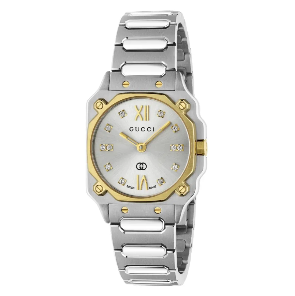 Vær den første til at anmelde “YA166503 – G-Flat 24mm rustfrit stål urkasse med 18 kt guldbelagt bezel og skruer; Sølvforzinket skive med romerske indekser kl. 12 og 6 og diamantindekser; Rustfrit stål armbånd” Annuller svar