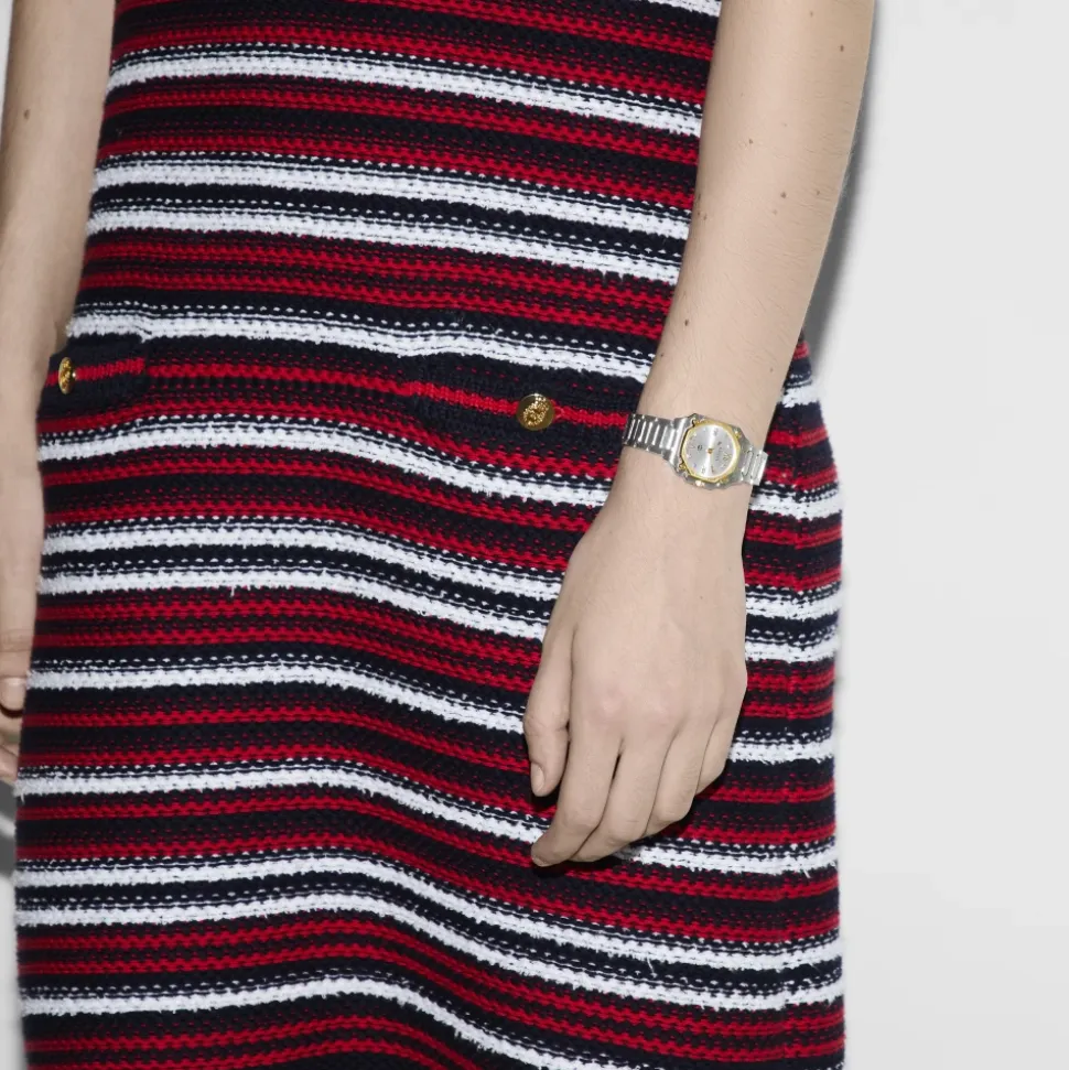 Forhøj din stil med dette Gucci ur til kvinder. Med en rustfri stålrem og safirglas er dette tilbehør både elegant og holdbart. Vandafvisende op til 5 ATM (50 meter/164 fod).