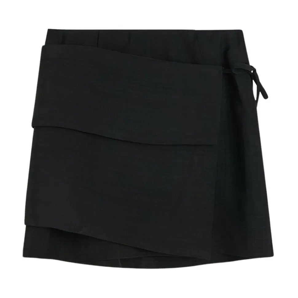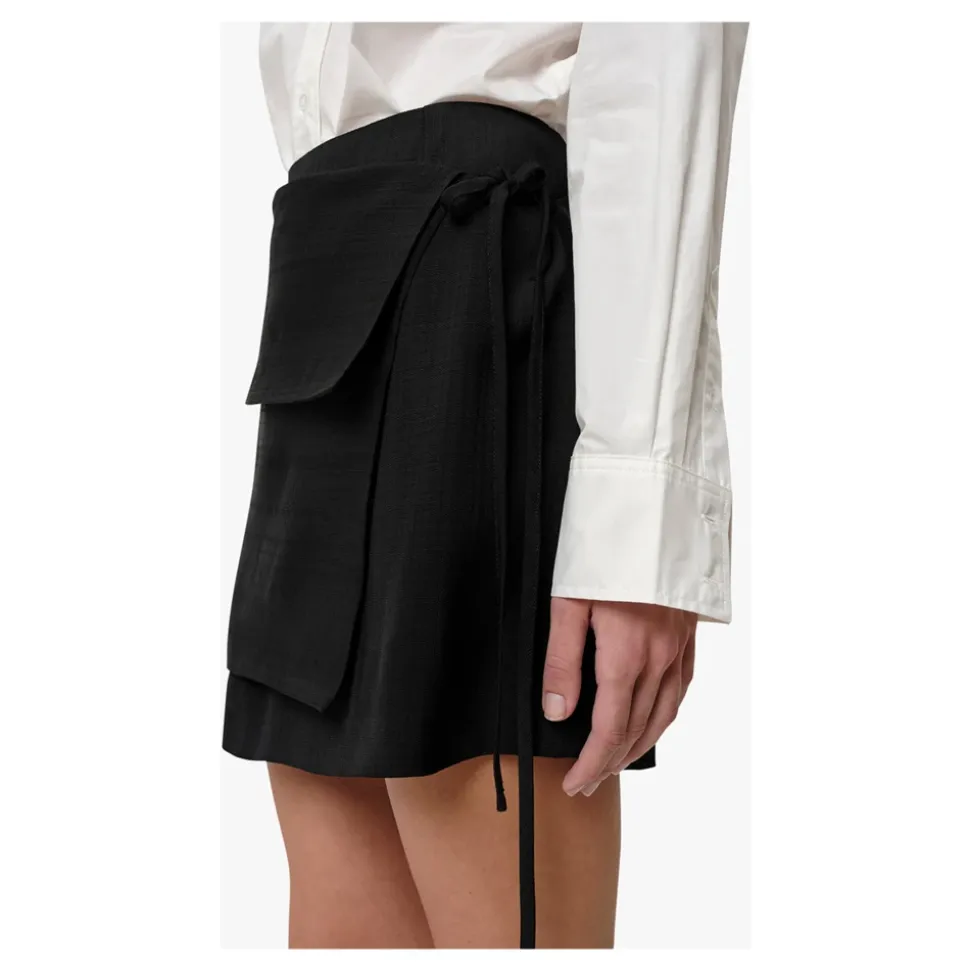 Birgitte Herskinds Yana Skirt er en asymmetrisk mini-nederdel, der defineres af en ekstra slå-om effekt, som bindes i siden, hvilket giver en moderne og markant silhuet til både dag- og aftenbrug. Vigtige egenskaber: Sort | Viskose | Sidebindelukning | Slå-om panel detalje | Asymmetrisk kant | Slå-om stofdetalje | Mini længde | Sammensætning & pleje: 100% viskose