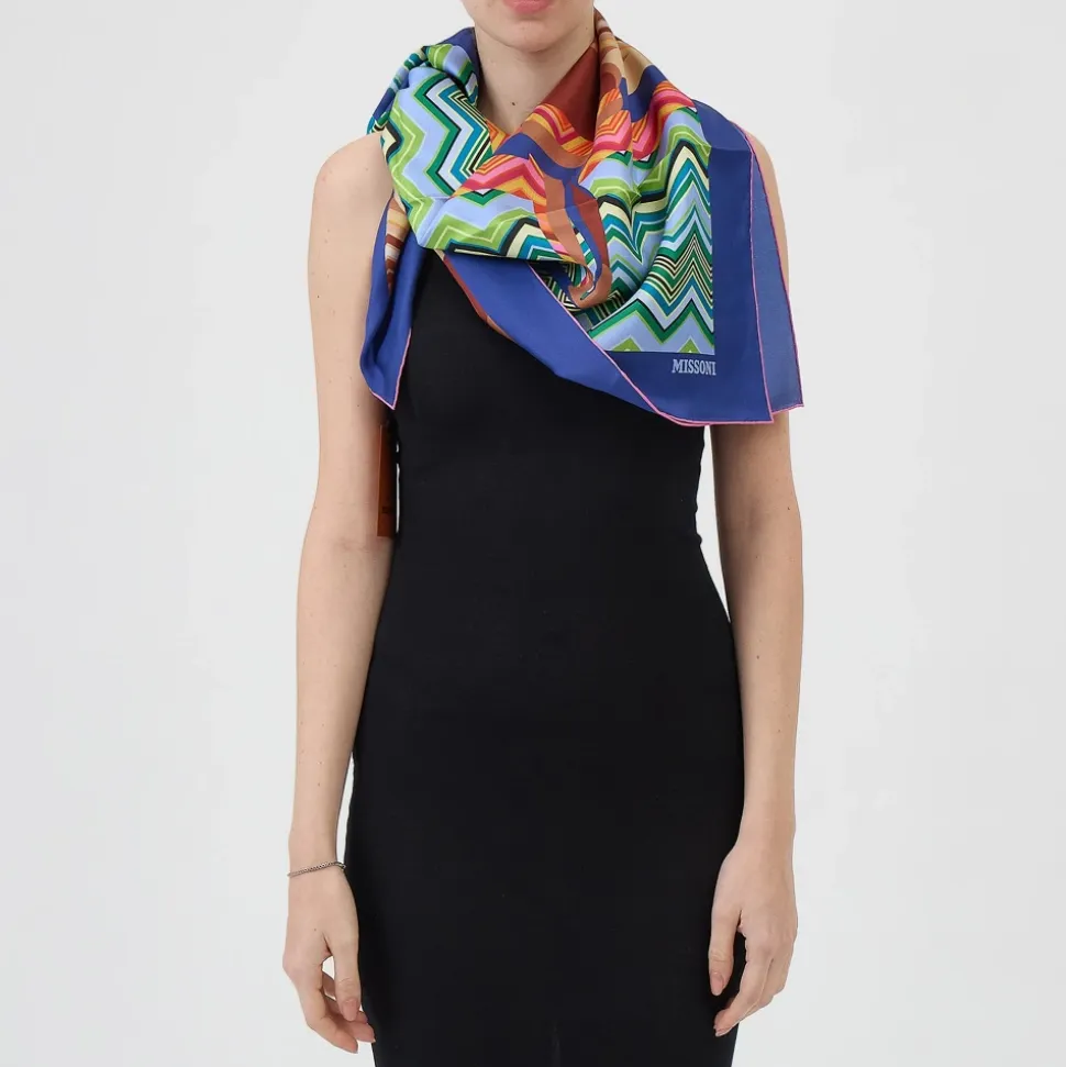 Tilføj et livligt touch til dit outfit med dette Missoni silketørklæde. De levende farver og ikoniske zigzag-mønster går sammen om at skabe det perfekte tilbehør til et frisk og cool look. Lavet af 100% silke i Italien, dette tørklæde har nuancer af blå, grøn, gul, hasselnød, orange og lyserød, måler 90×90 cm.