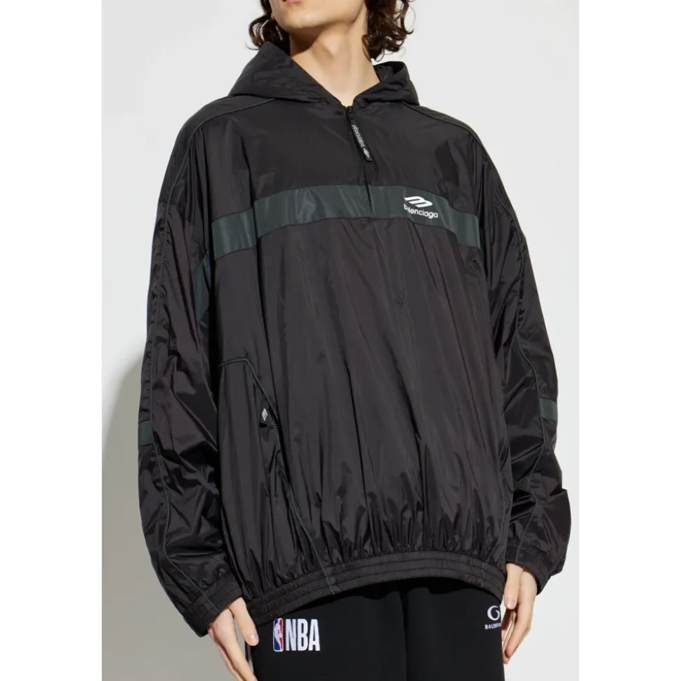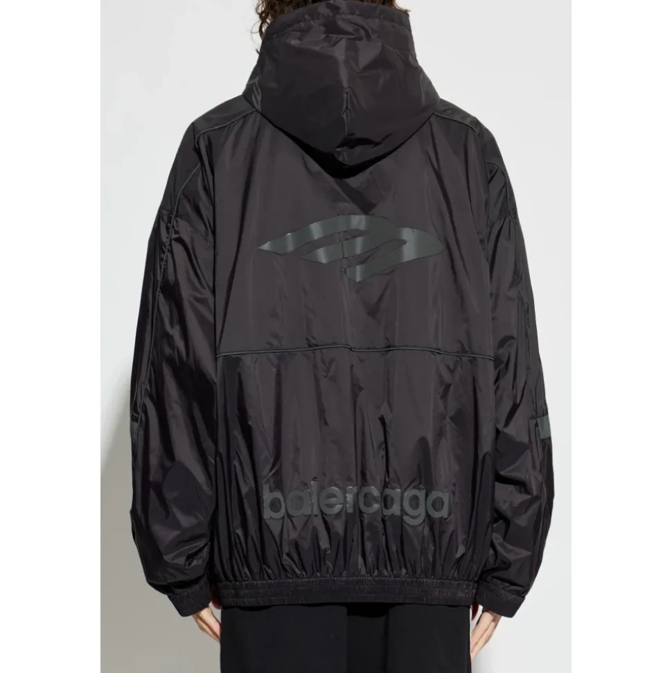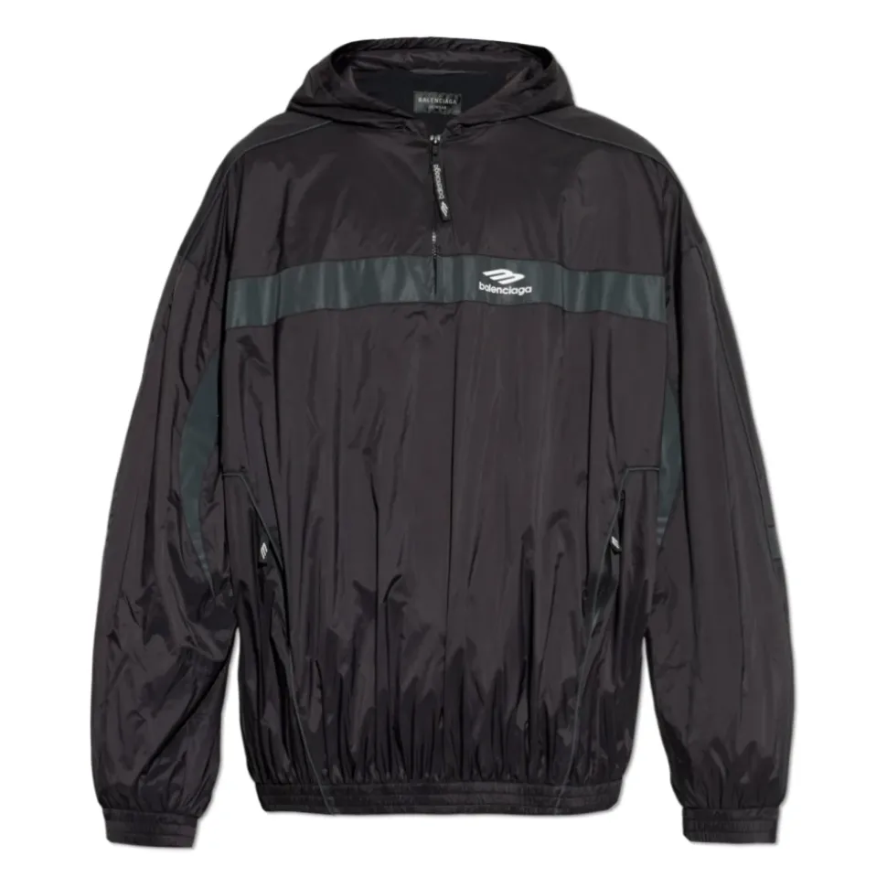 Balenciaga 3B Sports Icon Ski Tracksuit Hættetrøje kombinerer teknisk ripstop-konstruktion med reflekterende detaljer for sporty, gadeklart dækning. Dens halvlynede design og elastiske kanter tilbyder praktisk beskyttelse og ukompliceret lagdeling. Vigtige egenskaber: Sort | Polyamid | Letvægts teknisk stof | Polyurethanbelægning for ekstra beskyttelse | Halv lynlås foran | Hætte (ingen snøre) | 2 skrålommer med lynlås | Elastiske manchetter og linning | 3B Sports Icon artwork | Reflekterende bånd og artwork | Teknisk ripstop-tekstur | Bred dekorativ stribe hen over front og ærmer | Dimensioner og pasform: Modellens mål — Højde: 185 cm, Bryst: 92 cm, Talje: 74 cm, Hofter: 91 cm | Modellen er iført størrelse: L | Oversized pasform | Sammensætning og pleje: Hovedmateriale: 100% polyamid | Belægning: Polyurethan | Detaljer: 100% polyamid | Foring: 100% polyester | Vask max 30°C – Meget mild proces. Vask separat. Vask med vrangen ud. Må ikke bleges. Må ikke tørretumbles. Skånsom centrifugering, max 400 rpm. Hængetørres i skyggen. Må ikke stryges. Må ikke renses.