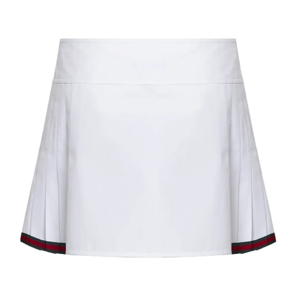 Gucci A-line Mini Nederdel kombinerer en raffineret A-line silhuet med plisserede sidedetaljer og husets signatur grøn-rød Web ved kanten, ideel til et poleret dags- eller aftenlook. Vigtige egenskaber: Hvid | Bomuld | Slå-om lukning med sideknap | Plisseret motiv på siderne | Grøn og rød Web-detalje ved kanten | Let udvidet bund | A-line silhuet | Dimensioner & pasform: A-line pasform | Let udvidet kant | Sammensætning & pleje: 100% Bomuld | Læs producentens plejeinstruktioner.