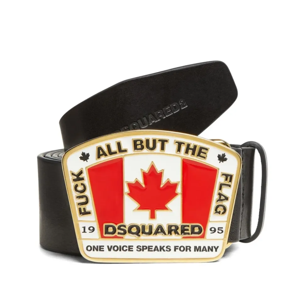Fremhæv dit outfit med dette klassiske sorte læderbælte fra DSQUARED2, der har en signatur canadisk flagmetalplade spænde. Lavet af 100% ko læder, er dette bælte et alsidigt tilbehør til mænd.