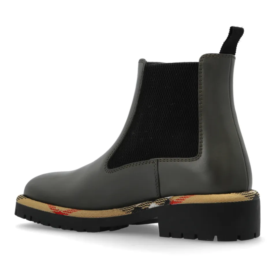 ANKLE BOOTS fra Burberry er inkarnationen af raffineret engelsk klassicisme og moderne enkelhed. De skiller sig ud med deres dybe grønne farve og KLASSISKE CHELSEA BOOT SILHUET med en subtilt afrundet tå og en slank profil, der perfekt fremhæver produktets karakter. Håndlavet helt i premium læder med en delikat mat finish, garanterer disse støvler ELEGANCE OG HOLDIGHED. Sorte elastiske sideindsatser sikrer nem på- og afklædning samt en perfekt pasform til enhver silhuet. Den tykke, flade gummisål med et solidt mønster tilbyder enestående stabilitet, mens den dekorative beige rem med et elegant motiv og røde accenter subtilt refererer til Burberrys signaturraffinement. På bagsiden fremhæver den karakteristiske sorte løkke det tidløse æstetik af denne model. HVORFOR SKAL DU VÆLGE DETTE PRODUKT? * Enestående materialekvalitet – ægte læder indvendigt og udvendigt * Unikke detaljer inspireret af Burberrys arv * Overlegen komfort og stabilitet * Fejlfrit klassisk design til at supplere enhver påklædning * Minimalistisk elegance uden synlige logoer Sål højde: 2cm Sål højde på det højeste punkt: 4cm