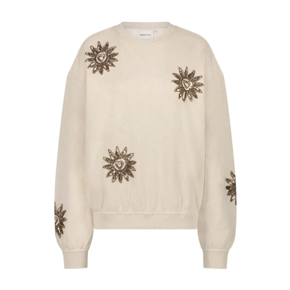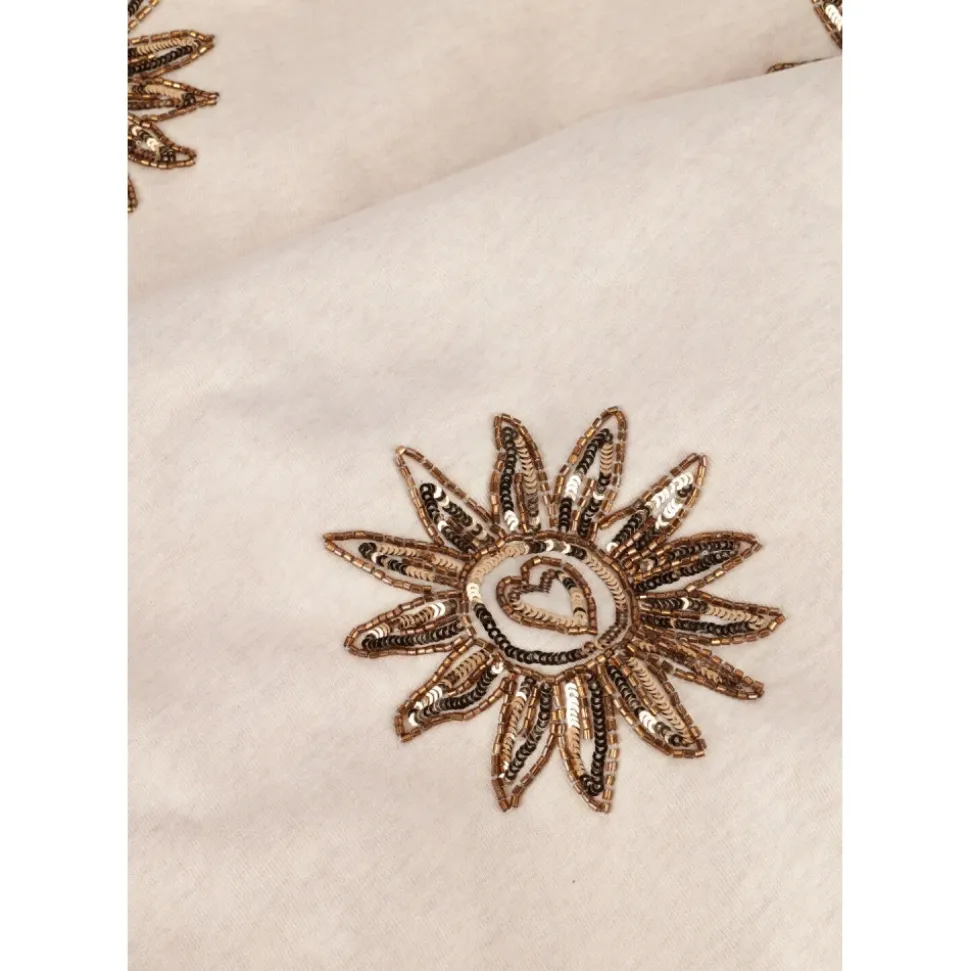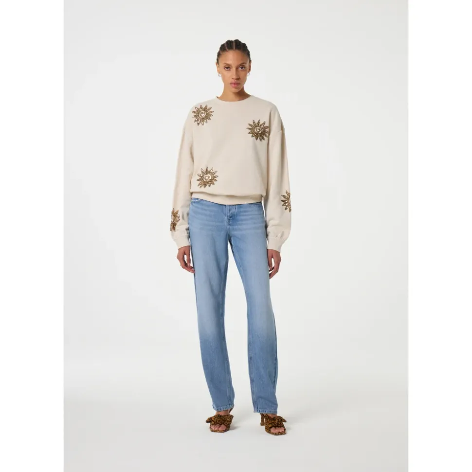 Opgrader din garderobe med denne beige FABIENNE CHAPOT ‘Archie’ bomuldsweater med delikate, gyldne broderede solmotiver. Denne sweatshirt har lange ærmer, en rund hals og er lavet af 100% bomuld.