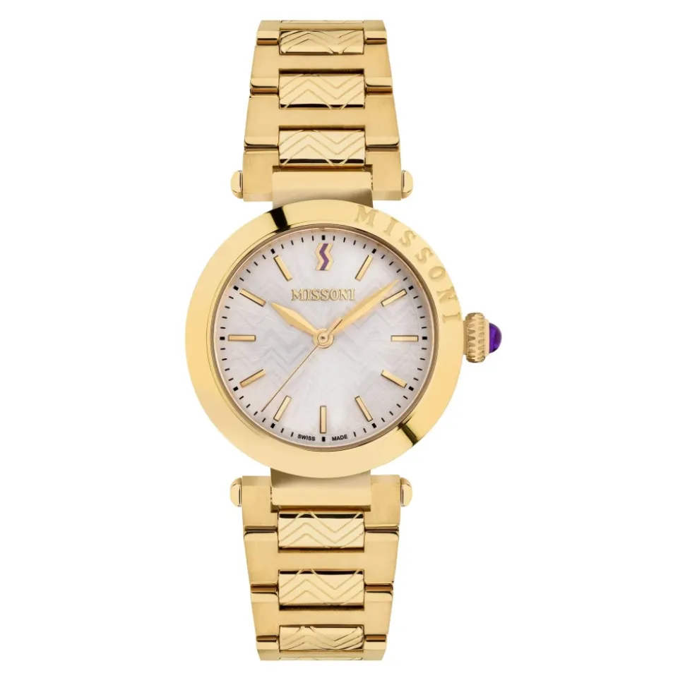 Den alsidige og stilfulde Missoni Atelier er et hverdagsur til formelle og afslappede lejligheder. De ikoniske detaljer og glade udsmykninger på kassen gør den til et tidløst, men moderne ur. To-tone 35mm kasse, To-tone armbånd, Hvidt guilloche urskive, 5 ATM vandtæthed, Foldeslås, Schweizisk kvartsbevægelse, Schweizisk 3-hånds kvartsbevægelse.