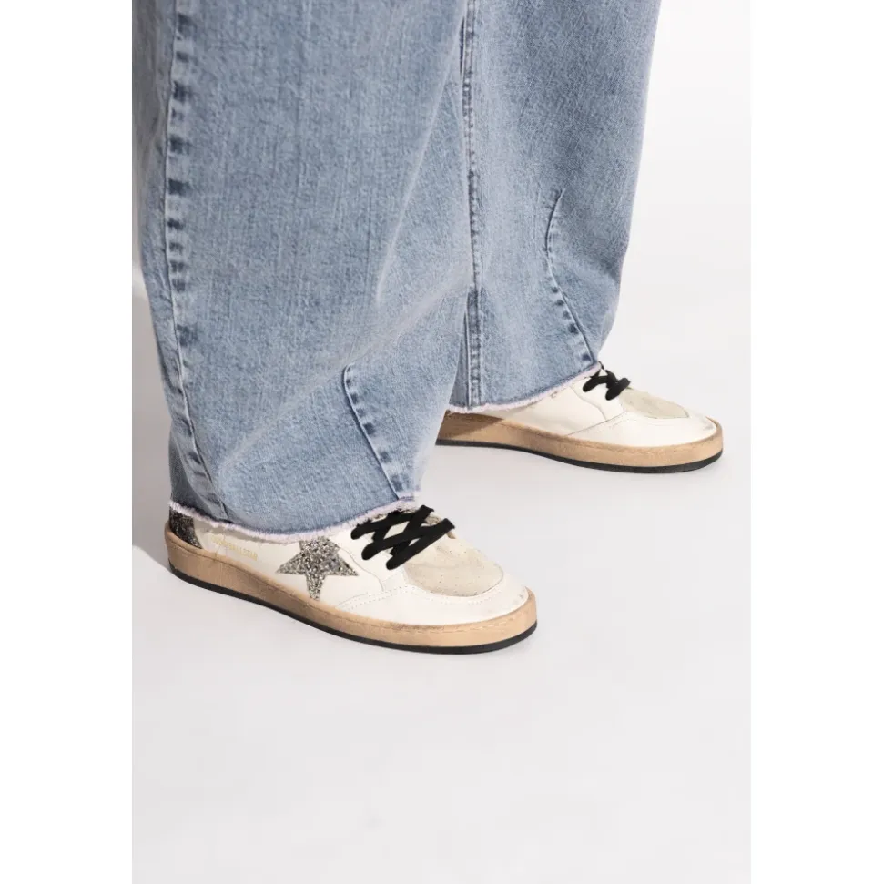 Golden Goose Ball Star Sneakers kombinerer en klassisk lav silhuet med labelets karakteristiske glitterstjerne og en vintage, slidt finish. Disse sneakers skiller sig ud med deres overdel i blandede materialer og kontrasterende glitterdetaljer. Vigtigste egenskaber: Hvid | Sølv | Læder | Snørelukning med flade sorte snørebånd | Gummisål | Kontrasterende sølvfarvet glitter hælkappe og hæl | Ikonisk sølvfarvet glitterstjerne på siden | Beige ruskindstå og -pløs | Metallisk guldfarvet logo på siden | Tonale logo bogstaver på hælene | Perforeringer på sider og tå | Rund tå | Logo patch på pløsen | Vintage, slidt look | Designer ID: GWF00117.F007472.12274 | Sammensætning & pleje: 82% kalveskind | 12% polyethylen | 6% bomuld
