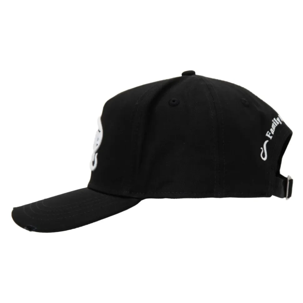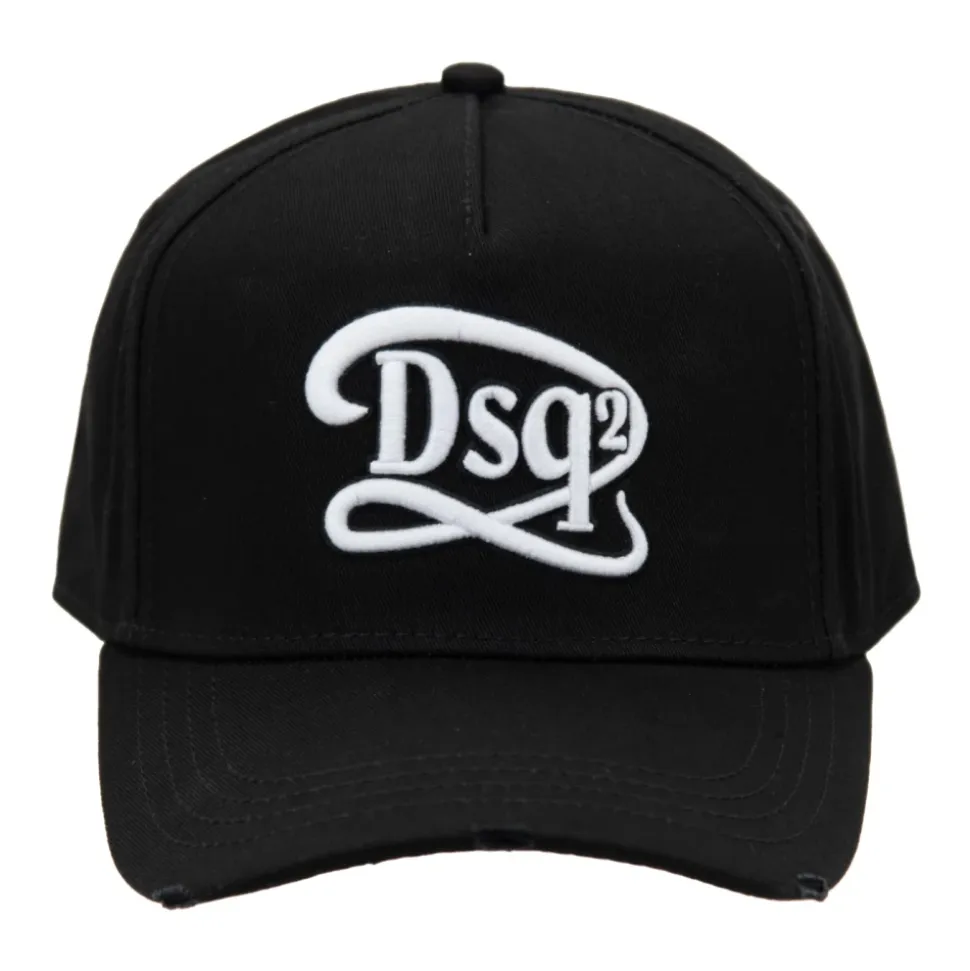 Løft din street style med denne Dsquared2 baseballkasket med præget design, der har et markant `DSQ2`-logo og distressed detaljer for et moderne udtryk. Produkt detaljer: Sort | 100% Bomuld | Spændelukning | Hævet logo | Kontrasterende reliefskrift | Distressed skygge | Dimensioner og pasform: One size fits all | Sammensætning og pleje: 100% Bomuld | Håndvask anbefales, må ikke tørretumbles.