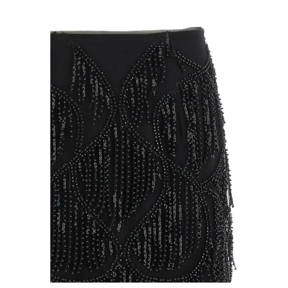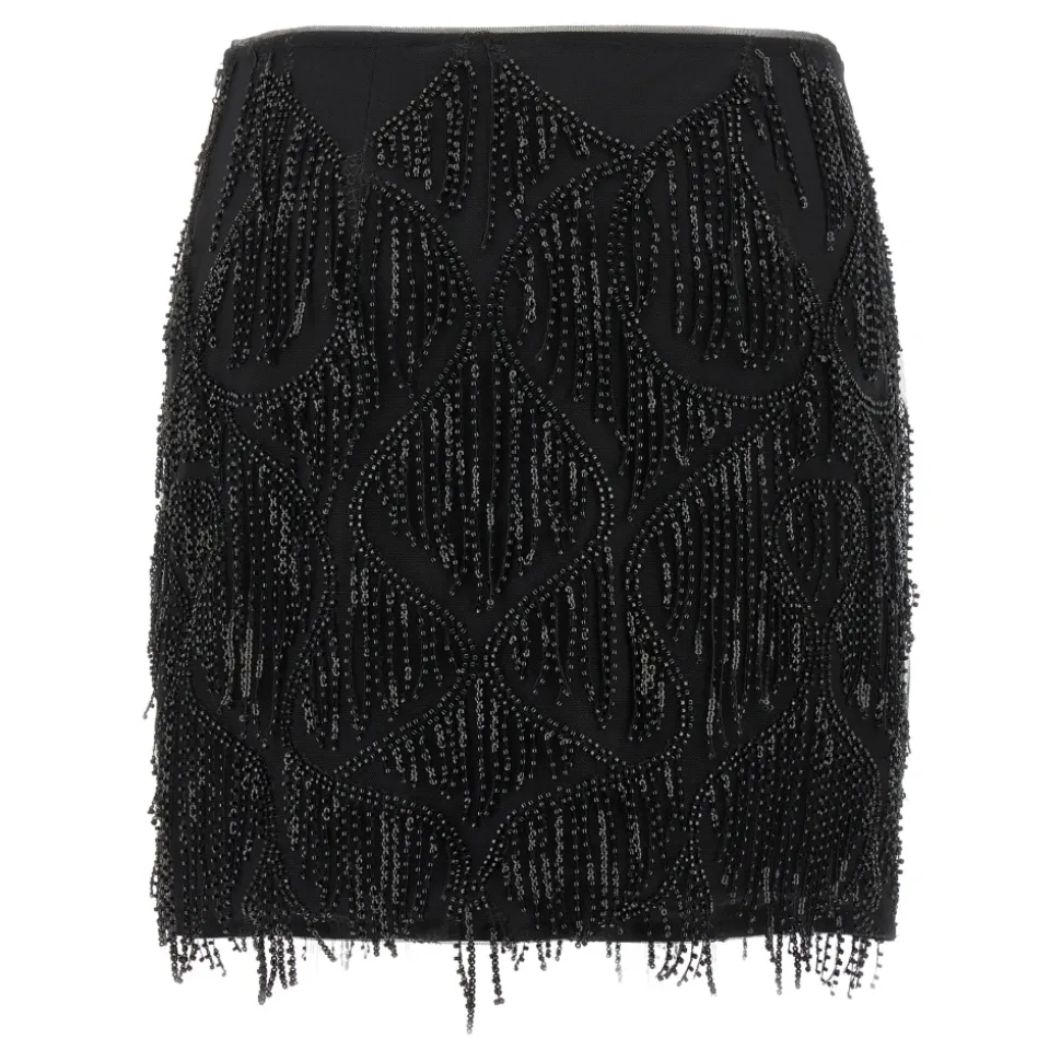 ROTATE Birger Christensen Beaded Fringed Skirt kombinerer pailletbroderet stof med perlebesatte frynser for en iøjnefaldende mini-nederdel, der er klar til fest. Den har en side lynlåslukning og et viskosefor for behagelig brug. Vigtige egenskaber: Sort | Viskose | Side lynlåslukning | Viskosefor | Pailletbroderi | Perlebesatte frynser | Mini længde | Dimensioner & pasform: Slim fit | Sammensætning & pleje: 97% viskose | 3% elastan