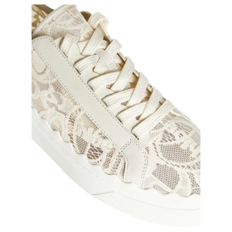 Opgrader dit sneaker-spil med Chloés Lauren sneakers i beige blonder-logo. Disse kvindelige sneakers har en afrundet tå, frontsnørebånd, tone-i-tone læderdetaljer, stofhælløkkefane med sort logo og hvid gummisål med bølget blondestil. Lavet af 100% læder.