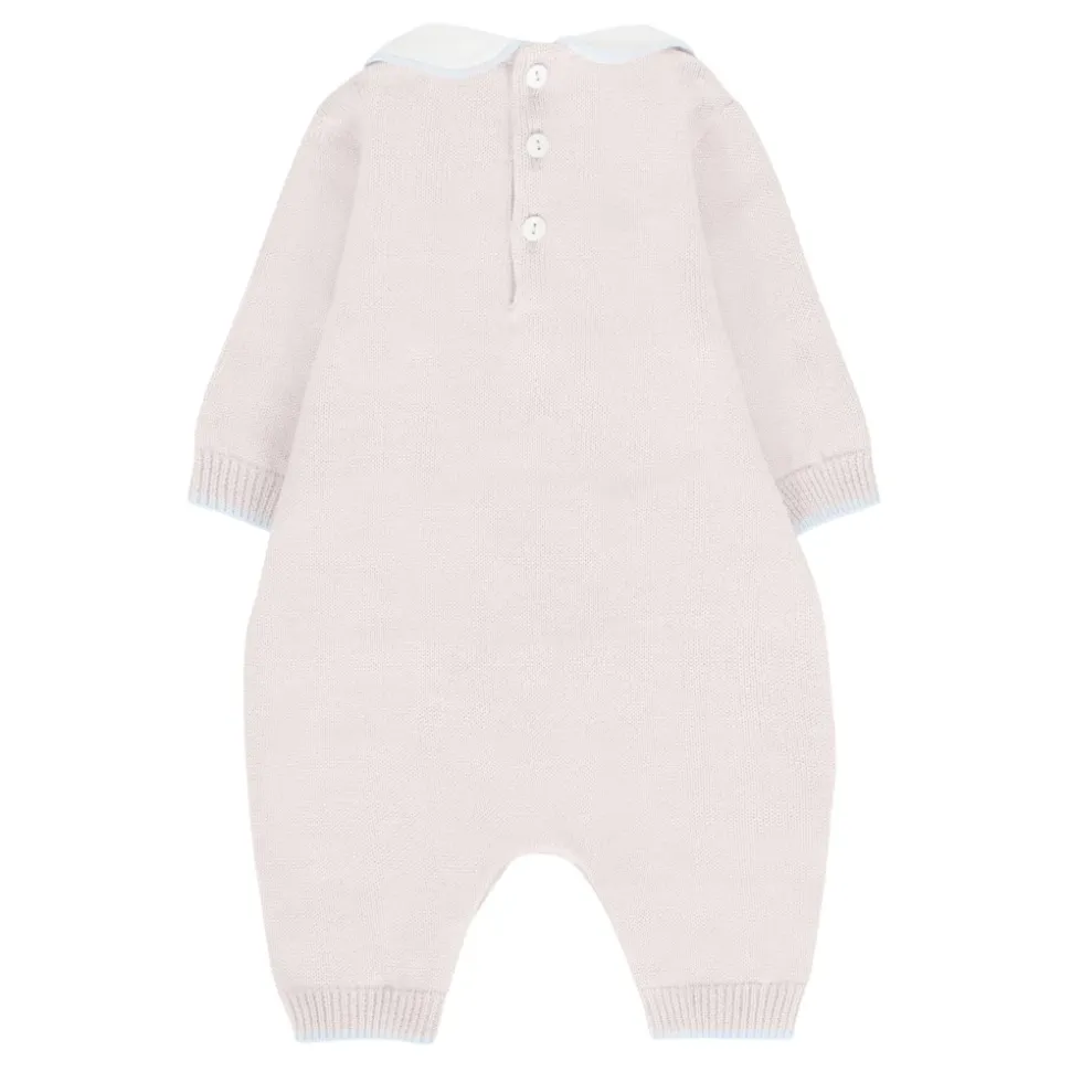 Klæd din lille i stil med denne beige uld jumpsuit fra Little Bear. Med lange ærmer, en bomuld poplin Peter Pan krave, perlemorsknapslukning bagpå og mellem benene, og udsmykket med en lyseblå bånd foran. Lavet i Italien af 100% ren uld. Plejeinstruktioner: Vask ved 30°C.