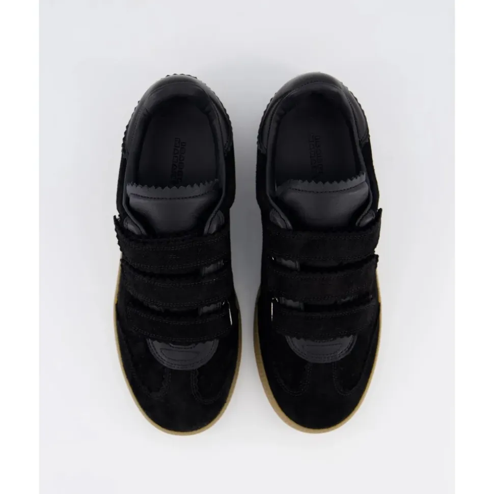 Opgrader dit sneaker-spil med disse sorte Isabel Marant ‘Beth’ lavtop sneakers. Lavet af blødt perforeret ruskind med en kalveskind hælkappe med mærkets logo. Sneakersne har en rund tå, tre striber med velcrolukning og en flad gummisål for hele dags komfort. Komplet med en polstret tunge, blødt læderforing, synlige perforeringer og takket kant.