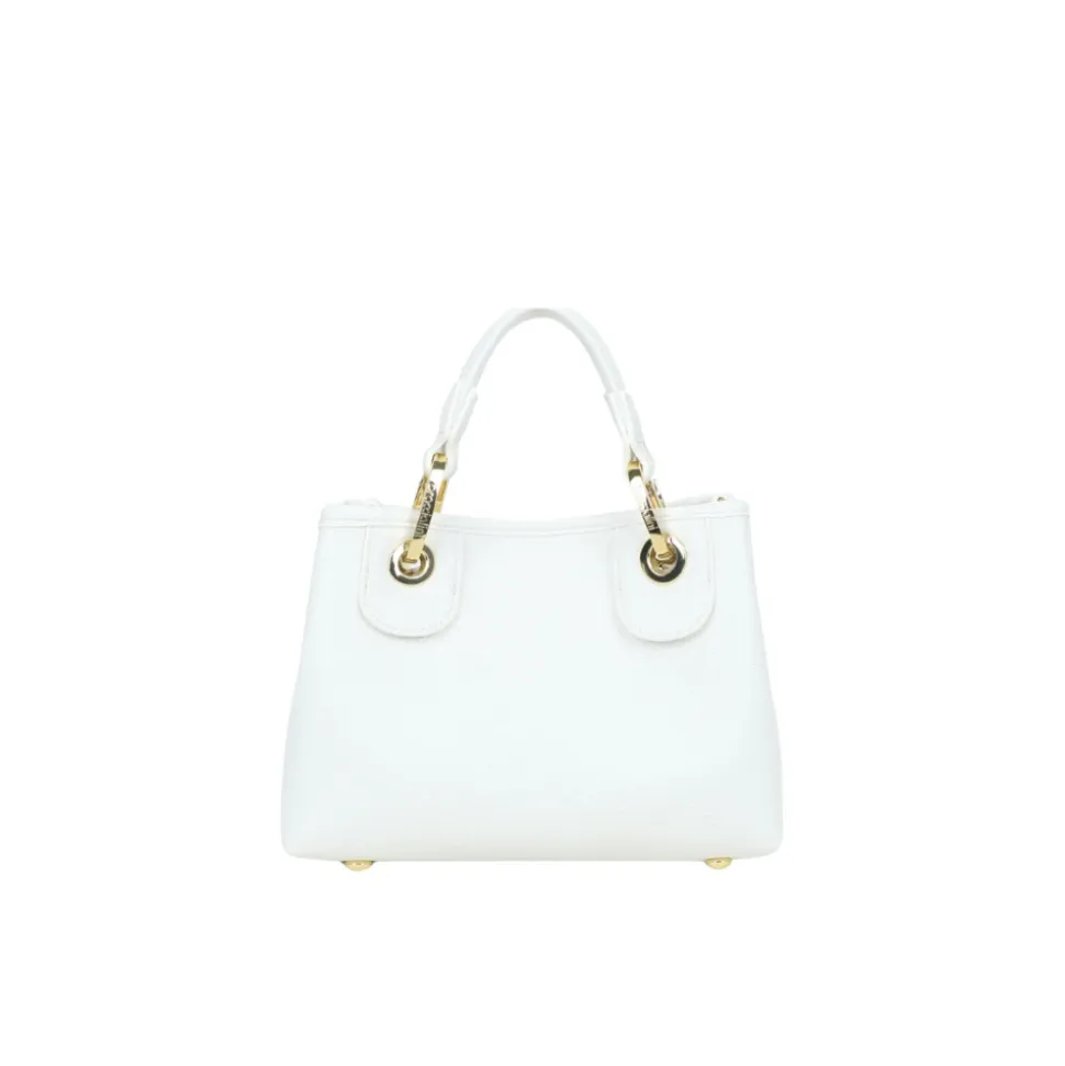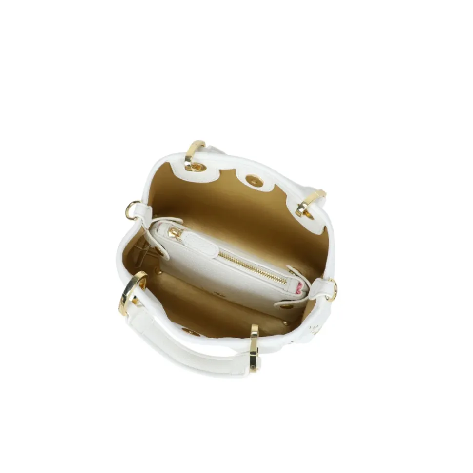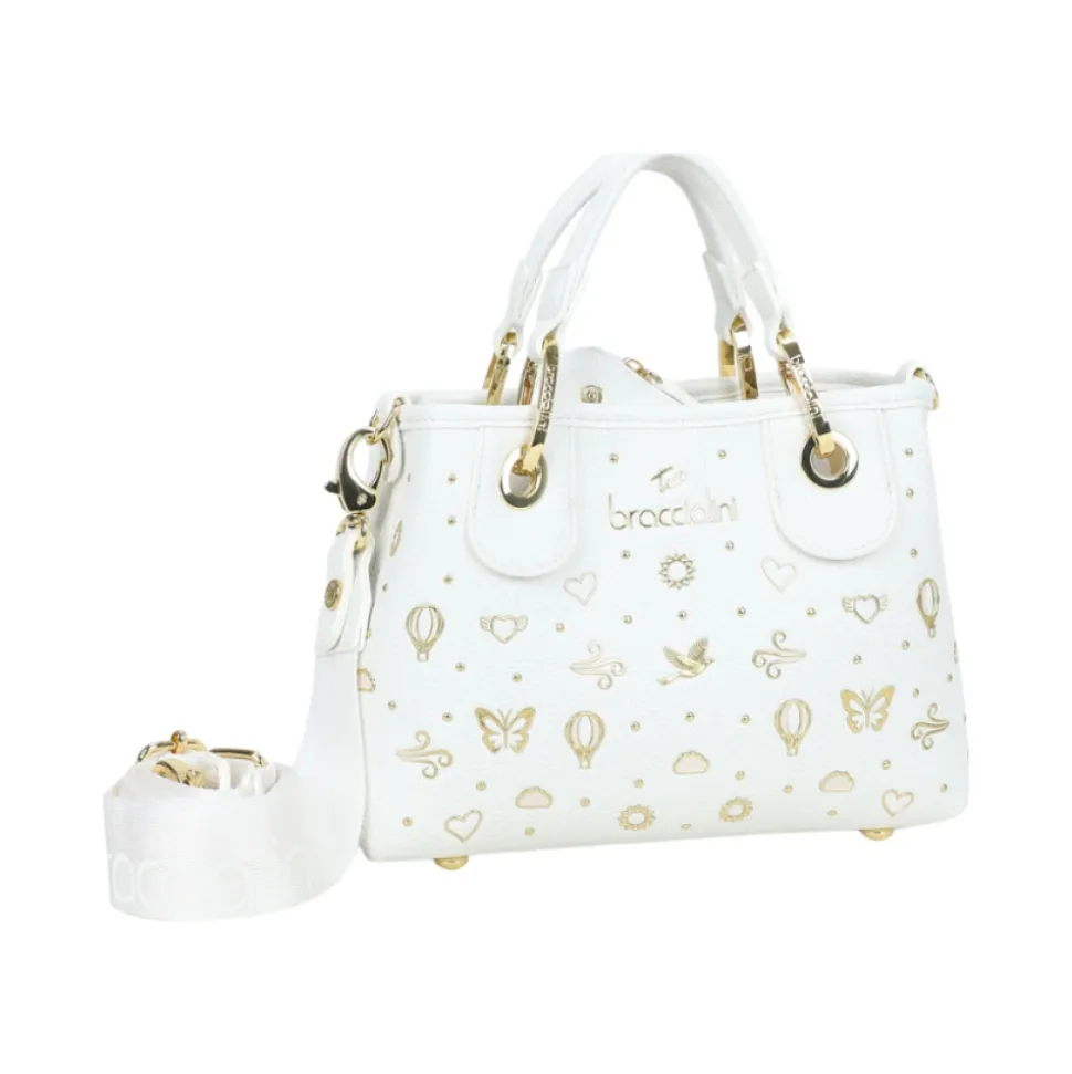Braccialini Beth Strass Lille Håndtaske kombinerer en funklende overflade med nitter og praktiske muligheder for at bære den på to måder. Den er ideel til brug fra dag til aften og kombinerer en aftagelig clutch med en logorem, for fleksibel brug. Vigtige egenskaber: Hvid | Bianco | Polisynt | Dobbelte håndtag | Aftagelig og justerbar logobæltet skulderrem | Aftagelig indvendig pose, der fungerer som en ekstra taske | Clip lukning | Guldfarvede nitter med motiver (hjerter, sommerfugle, varmluftballoner, skyer) | Funklende rhinestone- og nittedetaljer | Kompakt silhuet | Mål og pasform: 18 cm x 15 cm x 7 cm | Kompakt størrelse | Kan bæres på to måder: i hånden eller over skulderen | Sammensætning og pleje: Polisynt