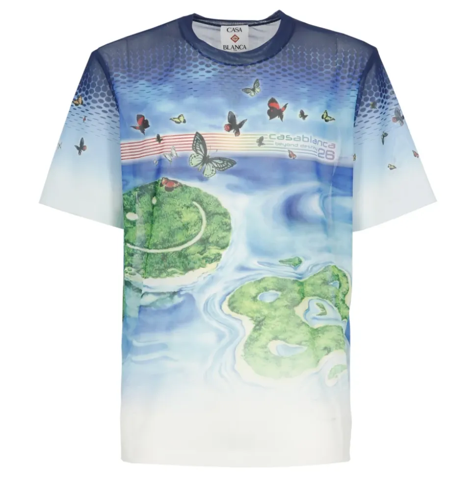 Casablanca Beyond Destiny Mesh T-shirt kombinerer labelens signatur Beyond Destiny all-over print med en let meshkonstruktion for et lagdelt look, der er perfekt til varmt vejr. Nøgleattributter: Blå | Lyseblå | Mesh | Rund hals | Korte ærmer | All-over Beyond Destiny print | Dimensioner og pasform: Modellen er 190 cm høj og bærer en størrelse L