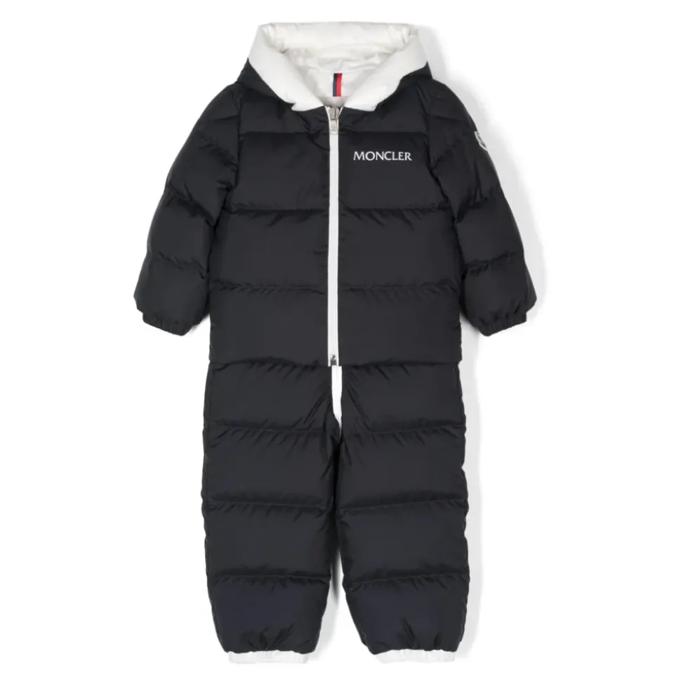 Hold dig varm og stilfuld med denne blå Moncler børns udendørs heldragt med gåsedun, eskimo-applikation med logo på brystet, hætte, lange ærmer, elastiske kanter og lynlås foran.