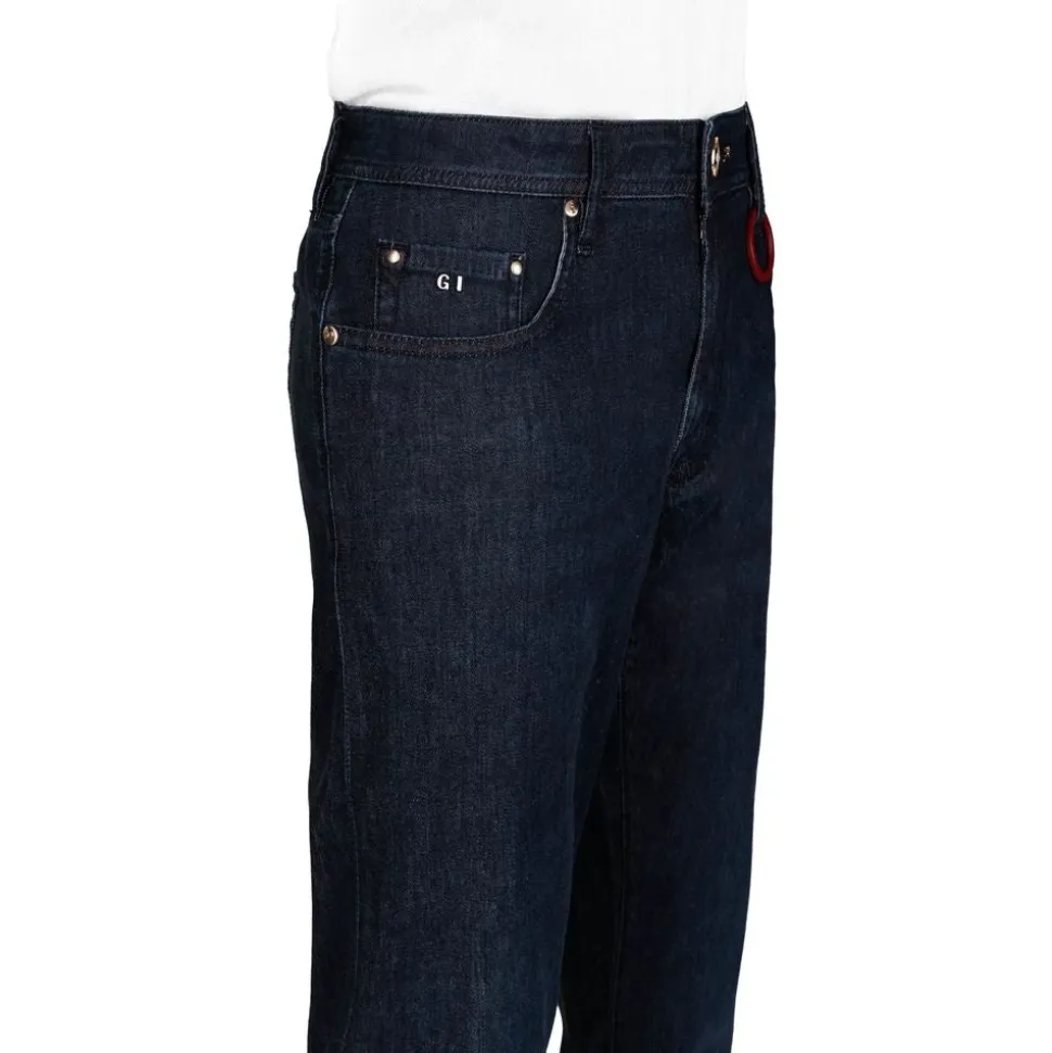 Tramarossa Michelangelo jeans i super let strækbar bomuld og viskoseblanding, med lynlås og knaplukning, fem lommer og en glat rød læderlap på bagsiden.