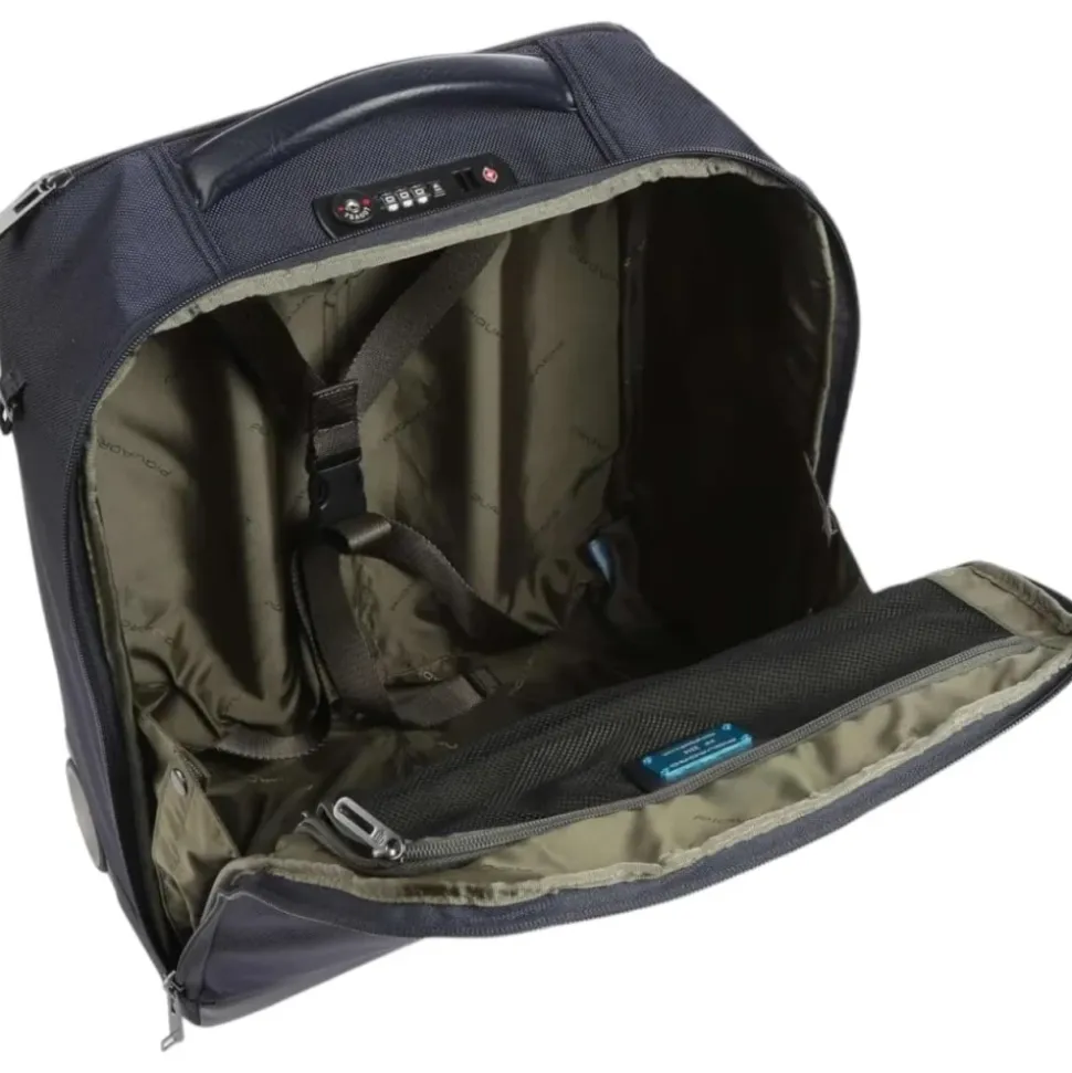 Piquadro Brief2 kollektion under-sædet trolley kabine taske til mænd, lavet af nylonstof med kombinations- og TSA-lås. Mål 35 x 45 x 20 cm. Har 1 rum, 1 håndtag, 2 hjul og eksterne lommer. Ideel til kabinstørrelse. Vejer 2222 g.