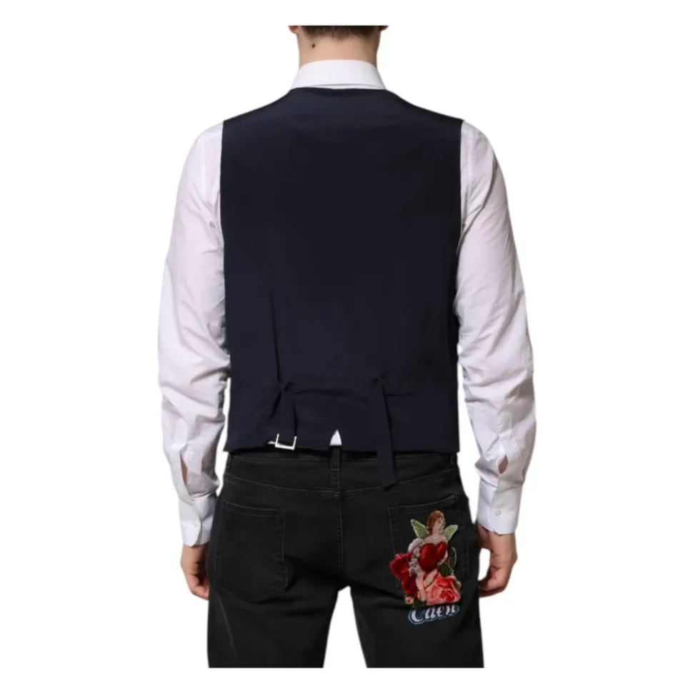 Løft din formelle påklædning med Dolce & Gabbana Blue Stripes Wool Formal Men Waistcoat Vest. Denne enkeltknap vest er lavet af 100% ren uld, hvilket sikrer en luksuriøs følelse og et sofistikeret look. Den justerbare rygstrop sikrer en skræddersyet pasform, mens den fulde frontknaplukning tilføjer et klassisk touch. Vesten har et elegant blåt striber mønster og er fuldt foret med 100% silke for ekstra komfort. Afsluttet med subtile logo detaljer, er denne vest et bevis på italiensk håndværk.
