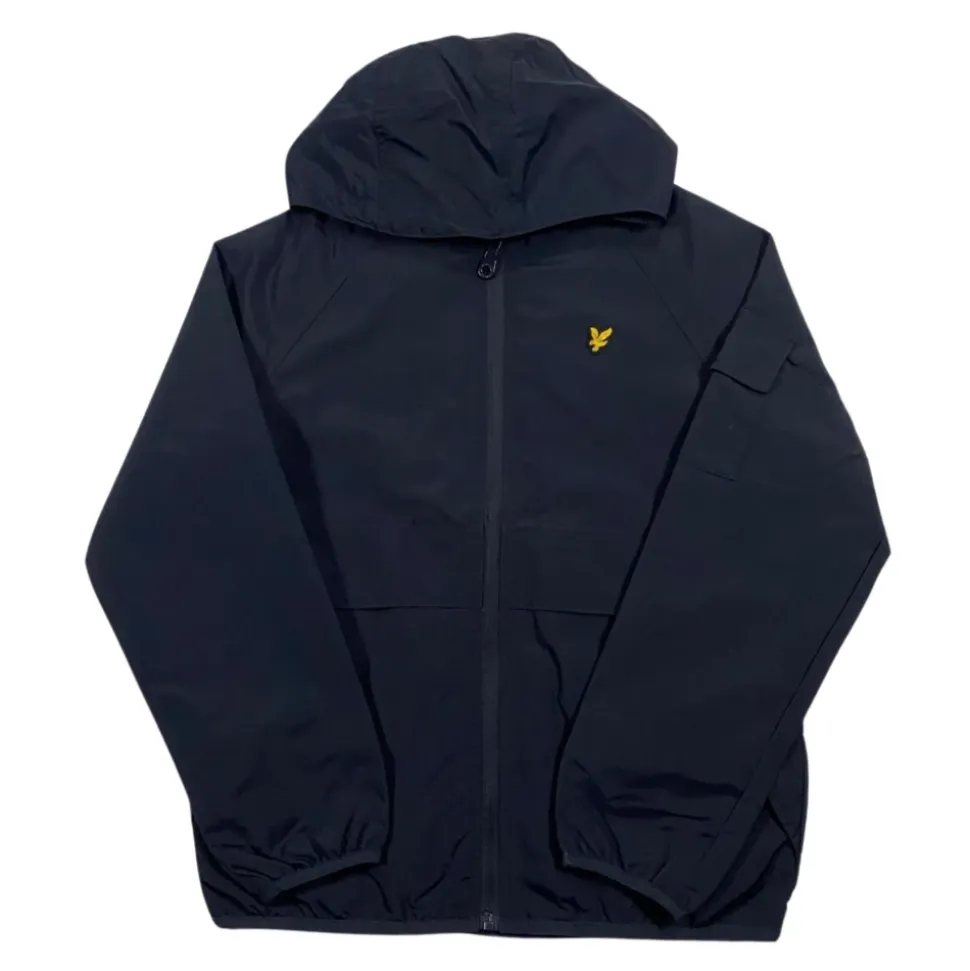 Lyle & Scott Kids blå jakke med fast hætte, vindtæt, lynlåslukning, sidelommer med lynlås, broderet kontrastlogo på brystet, lige kant, almindelig pasform. Sammensætning: 100% nylon.