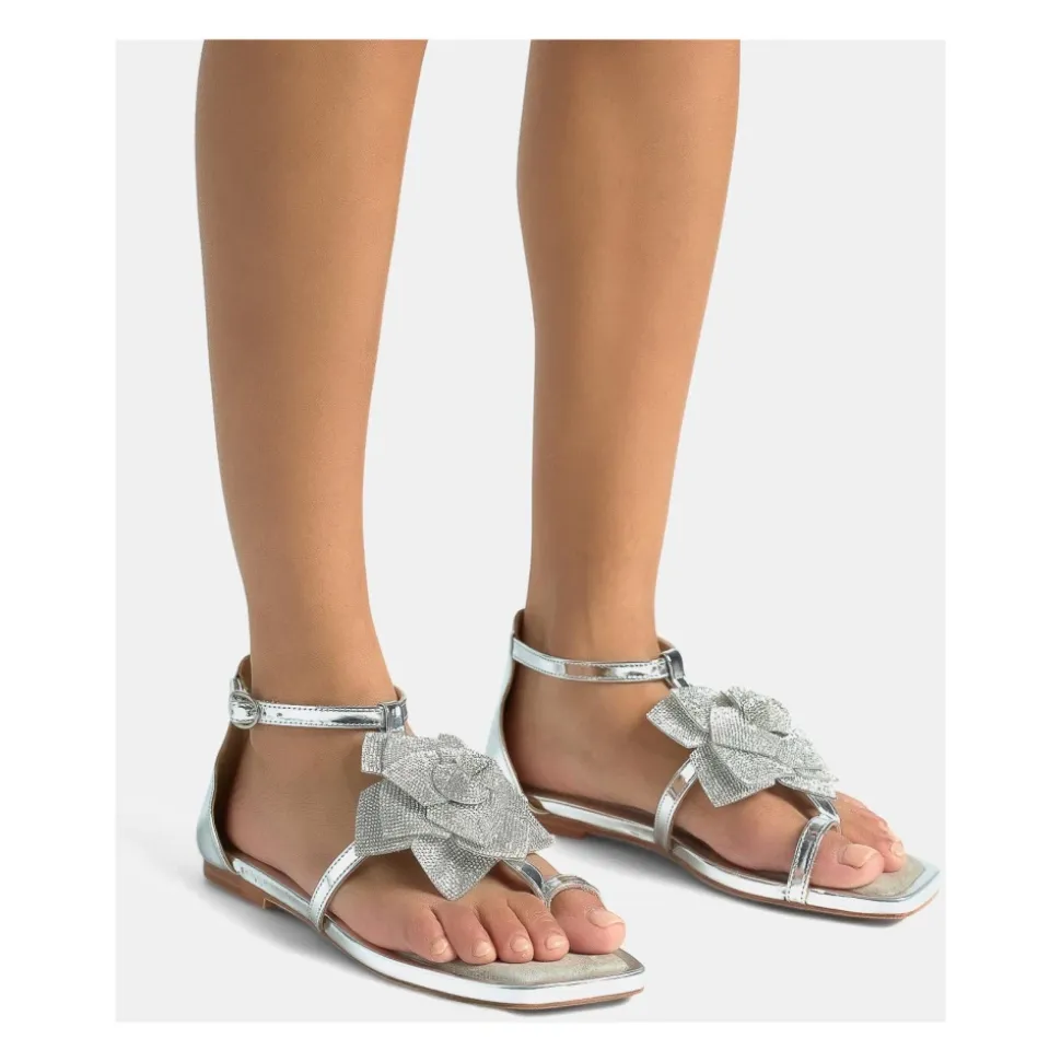 Flad sandal dækket med rhinsten, med ankelrem. Fremstillet i tekstil og med en hælhøjde på 2,3 cm.