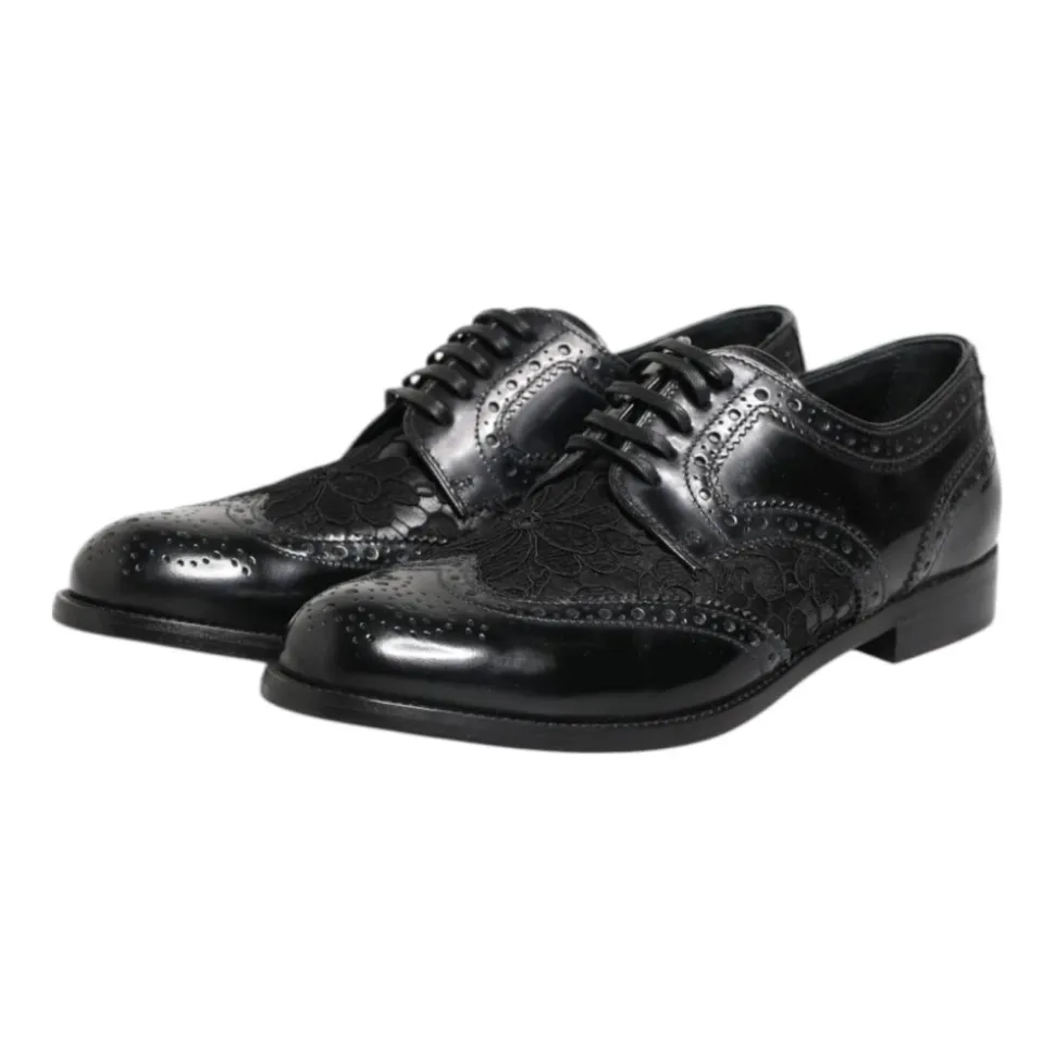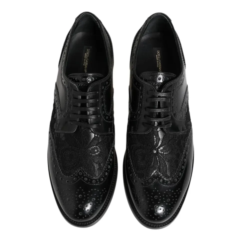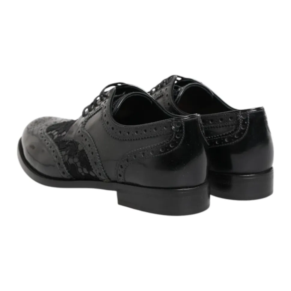 Løft din stil med disse spritnye 100% autentiske Dolce & Gabbana derby sko. Fremstillet af luksuriøst sort læder med elegant blomstret blonder, tilbyder disse sko en raffineret og feminin silhuet perfekt til formelle lejligheder eller ethvert stilfuldt outfit. Lavet med italiensk håndværk, kombinerer de tidløs sofistikation med Dolce & Gabbanas signaturstil.