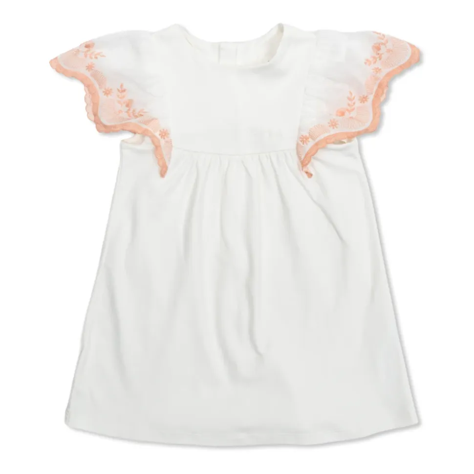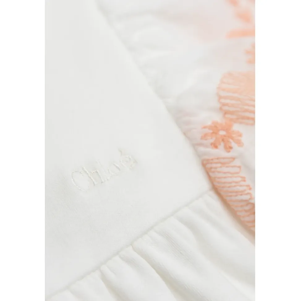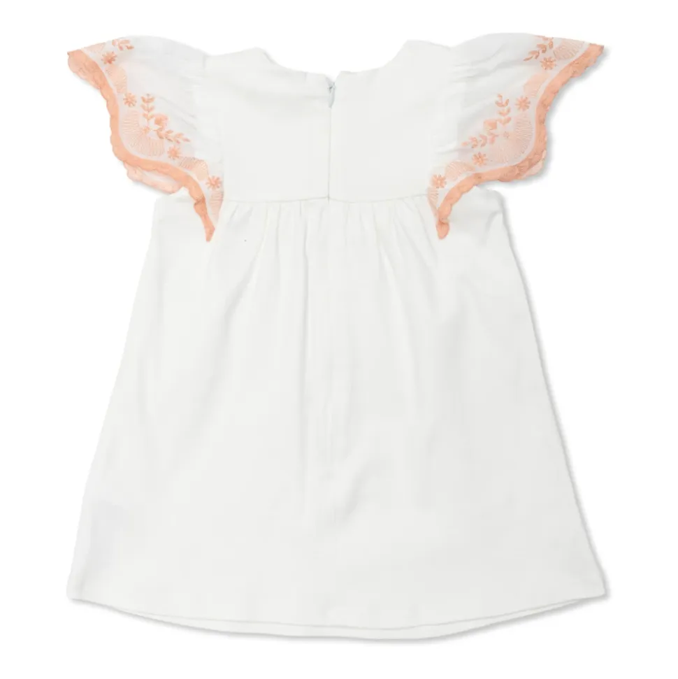 Chloé bomuldskjole kombinerer raffinerede klassiske detaljer med delikat planteinspireret broderi. Den åndbare bomuldskonstruktion og korte sommerfugleærmer gør den velegnet til både hverdagsbrug og særlige lejligheder. Vigtigste egenskaber: Hvid | Bomuld | Åndbart stof | Blød fornemmelse | Korte sommerfugleærmer | Planteinspireret broderi i ferskenrosa | Subtil flæsekant | Tonalt broderet logo på brystet | Dimensioner og pasform: Simpelt, let udskåret snit | Sammensætning og pleje: Bomuld
