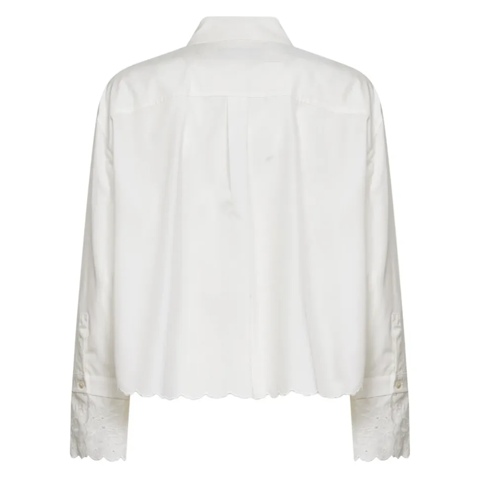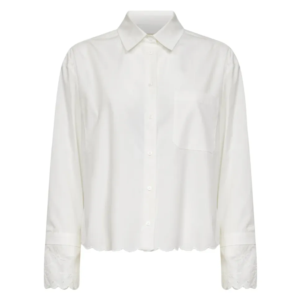 Weekend Max Mara bomuldsskjorte med brystlomme kombinerer klassisk poplin-skrædderi med bølget broderie anglaise-blonde for en raffineret hverdagsskjorte. Vigtige egenskaber: Elfenben | Bomuldspoplin | Stolpelukning foran | Påsyet brystlomme | Perlemorsknapper | Spids krave | Bølget broderie anglaise-blondekrave og -manchetter | Lange ærmer | Bløde skuldrer | Bærestykke bagpå med læg | Afrundet, bølget kant | Lille tone-i-tone sommerfuglelogo broderet på venstre side | Mål og pasform: Lige pasform | Sammensætning og pleje: Materiale: 100 % bomuld | Broderitråd: 100 % polyester | Indeholder ikke-tekstil dele af animalsk oprindelse | Håndvask kold (40 °C maks.); må ikke bleges; må ikke tørretumbles; tørres på tørresnor i skyggen; kølig strygning; professionel renseri (perchlorethylen, mild); må ikke vådrenses; vaskes lukket; vendes før vask; må ikke stryges på broderiet.