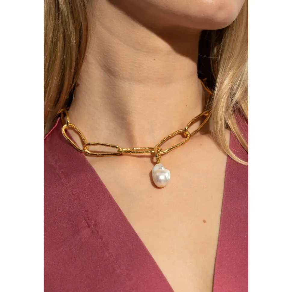 BRONZE HALSKÆDE af forte_forte er et enestående eksempel på den reneste smykkekunst. Den består af store, uregelmæssige, ovale led, der harmonisk er kombineret til en iøjnefaldende kæde, hvis minimalistiske form fanger med sin lethed og finesse. Delikat hamrede overflader fremhæver det kunstneriske, håndlavede karakter af produktet, som er essensen af italiensk håndværk. Hele stykket er lavet af BRONZE belagt med en hypnotisk gylden glans – et materiale, der giver både glans og prestige. En stor, uregelmæssig hvid perle skiller sig ud som den centrale detalje og en raffineret accent til smykket. FORTE_FORTE, et brand kendt for sin sofistikerede tilgang til design, præsenterer her et unikt halskæde, der skaber en dialog mellem tradition, modernitet og individuel stil. HVORFOR VÆLGE DETTE PRODUKT? * Håndhamrede led med en unik silhuet * Luksuriøs guldfarvet finish * Original detalje i form af en iøjnefaldende, perle * Design af det prestigefyldte italienske brand forte_forte * Smykker med en tidløs karakter og ekstraordinær elegance