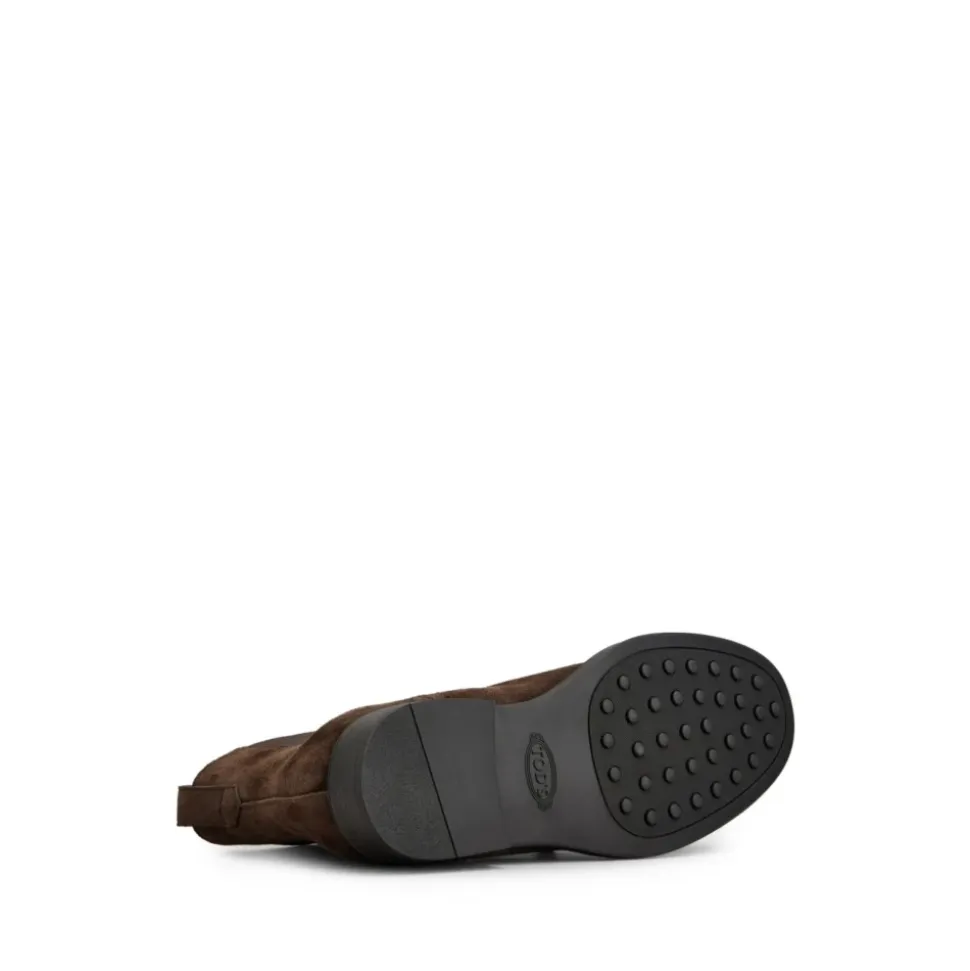 Tod’s kaffebraune Chelsea-støvler til mænd med elastiske sider, lav stablet hæl og rund tå.