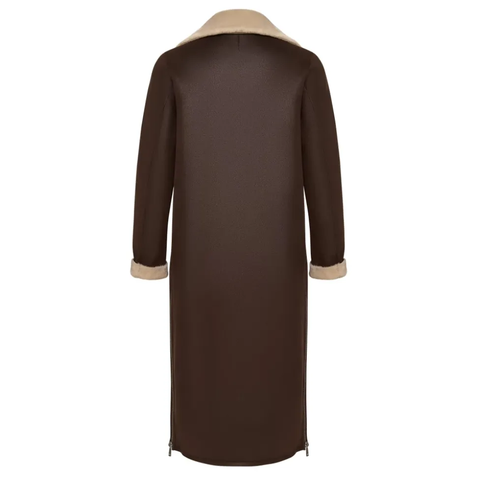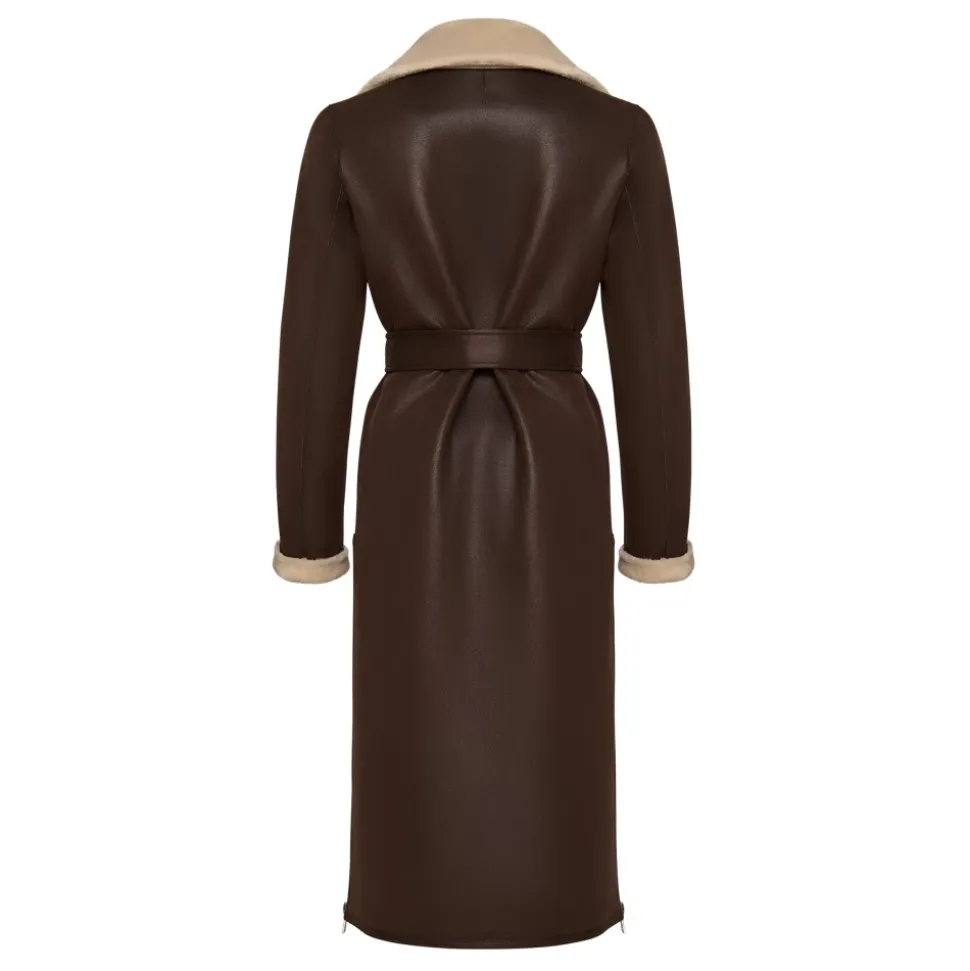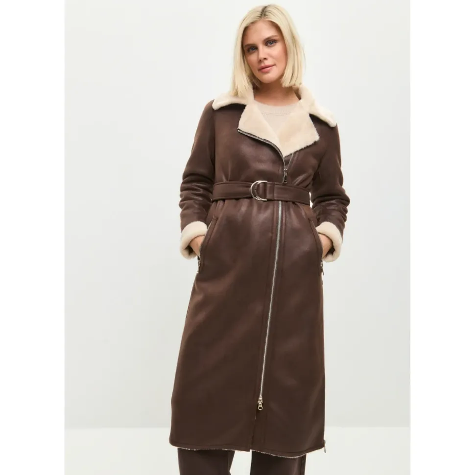 Denne iøjnefaldende brune faux shearling frakke kombinerer elegance og praktisk anvendelighed. Med en moderne lynlåslukning og et taljebælte giver den en skræddersyet silhuet med maksimal varme og komfort fra faux fur-foret. Produkt detaljer: Brun | Faux læder (polyesterblanding) | Justerbart taljebælte | Reversibelt design | Stor reverskrave med faux fur-accenter | Sideslidser med lynlås | Langt design | Dimensioner og pasform: Skræddersyet pasform | Sammensætning og pleje: Ydermateriale: Faux læder (polyesterblanding) | Indvendig foring: Blød faux shearling 43% modakryl 36% polyester 21% akryl | Renseri anbefales