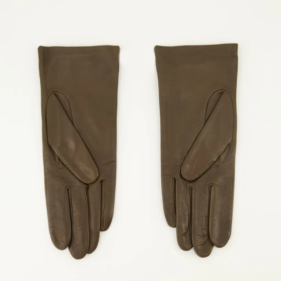 Disse brune læder AMI de Coeur handsker, skabt af AMI Paris, er en unisex model til kvinder. En del af efterår-vinter 2025 kollektionen, lavet af lammeskind læder.