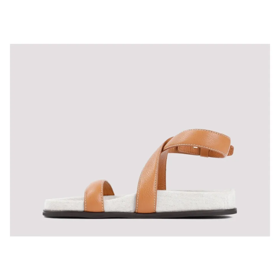 Forhøj din stil med disse elegante Totême lædersandaler. Fremstillet af ren tan brunt læder, har disse kraftige sandaler en rund og åben tå, tonal læderrem og en justerbar ankelrem for en tilpasset pasform. Den hvide og sorte sål tilføjer et moderne touch. Perfekt til enhver lejlighed, disse sandaler er et must-have for enhver modebevidst kvinde. Træd ud i stil med Totême…