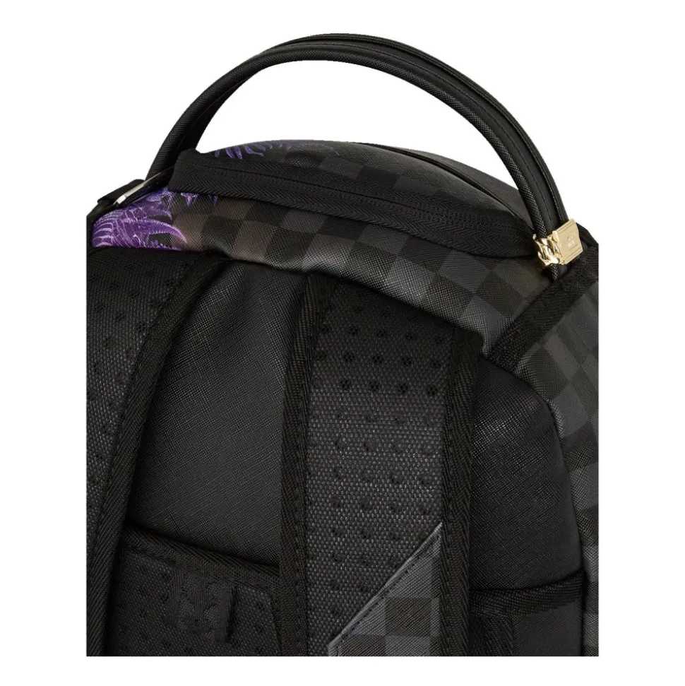 DLXV = 100% ECOPELLE Frontlomme med lynlås Sidelommer Skjult lynlåslomme Separat rum til solbriller med fløjl Ergonomisk netpolstring på bagsiden Justerbare stropper til personlig tilpasning Lynlåse med metalhardware Badge “Sprayground Authentic” Bagsiden kan sættes fast på håndbagage for at have hænderne fri Separat rum til bærbar computer Holdbart vandafvisende vegansk lædermateriale. Ca. 46x30x15 cm