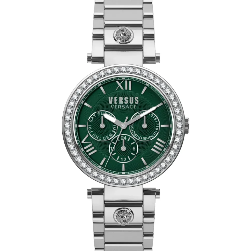 Forhøj din stil med dette fantastiske Versus Versace ur fra Camden Market kollektionen. Designet til den moderne kvinde, dette kvartsur har en Dato-Dag funktion, krystal accenter på kassen, og et elegant sølv rustfrit stål armbånd. Den grønne urskive tilføjer et pop af farve, mens den 38mm sølv kasse udstråler elegance. Vandafvisende op til 3 ATM, dette ur er både fashionable og funktionelt. Forkæl dig selv med luksus med Versus by Versace VSPCA5021.