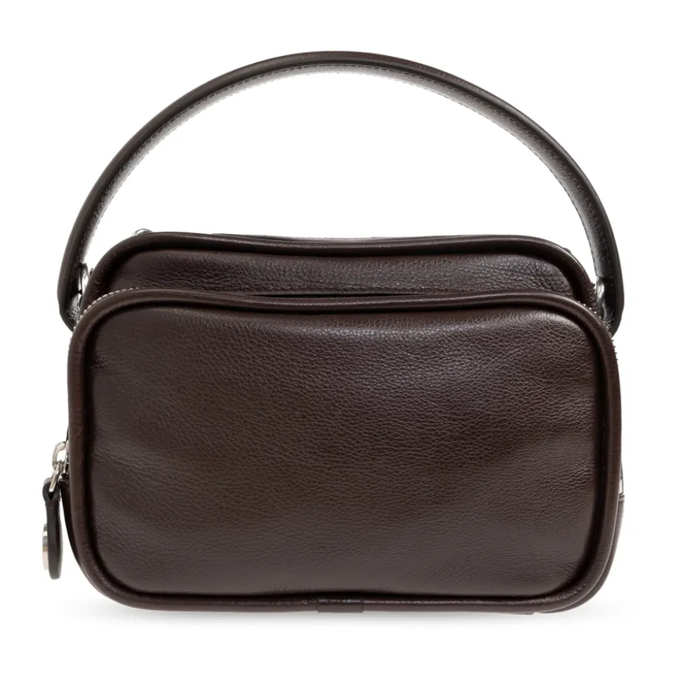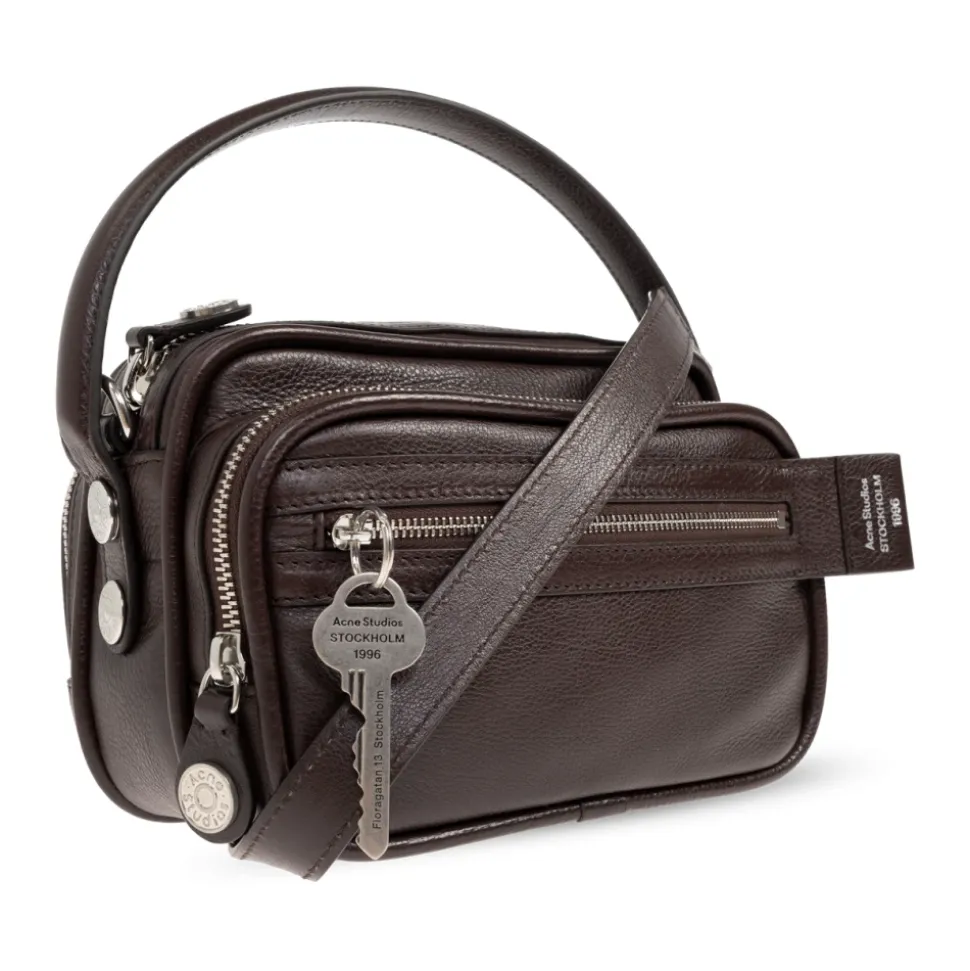 Acne Studios Camero Kit Crossbody Taske kombinerer en kompakt, rektangulær silhuet med flere lynlåsrum til organiseret hverdagsbrug. Dens narvede kalveskind og sølvfarvede hardware giver et raffineret og alsidigt look til brug fra dag til nat. Vigtige egenskaber: Chokoladebrun | Kalveskind | Håndtag | Justerbar skulderrem | Flere lynlåsrum | Hovedlynlåslukning | Rektangulær, kompakt form | Småkornet, skinnende lædertekstur | Minimalistisk silhuet | Nøgleformet vedhæng med diskret gravering | Sølvfarvet metalhardware og lynlåsdetaljer | Mål og pasform: Højde: 13 cm | Bredde: 20 cm | Dybde: 11 cm | One size | Sammensætning og pleje: Ydermateriale: 100% kalveskind | Foring: 50% polyester, 50% polyurethan