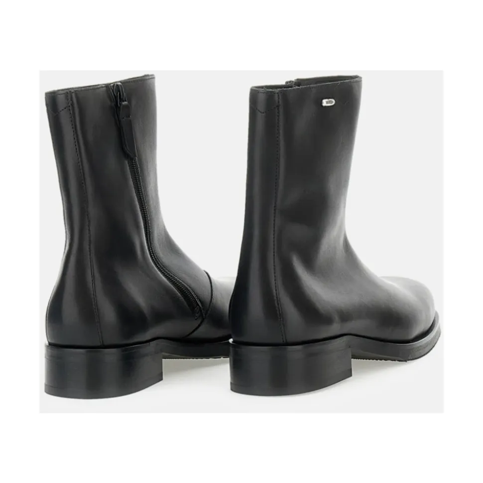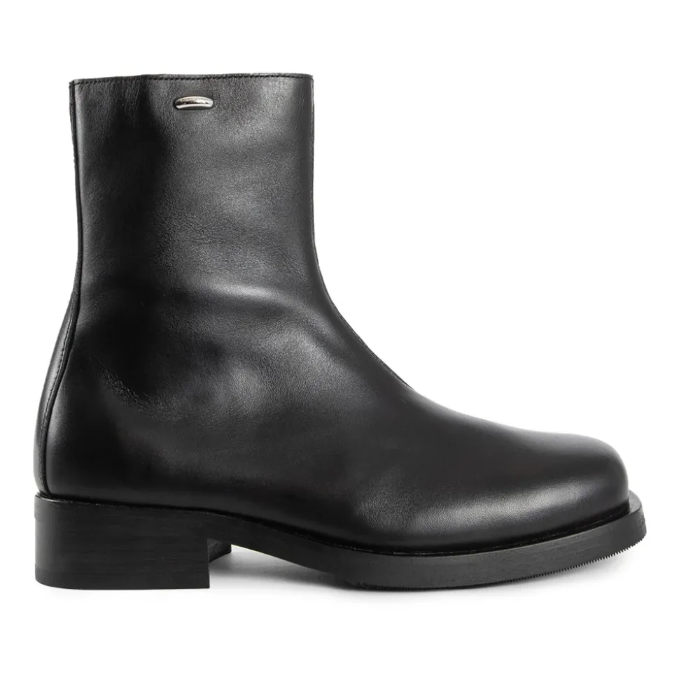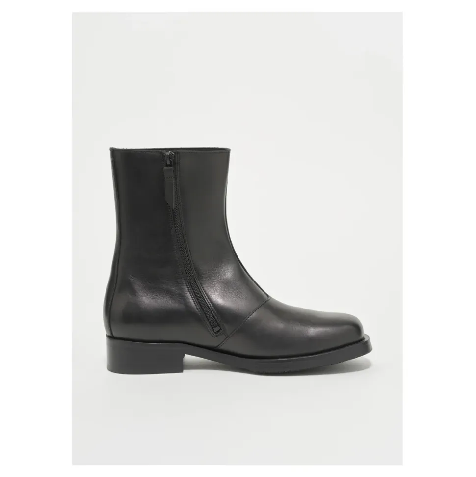 Our Legacy Camion Boot er en italiensk ankelstøvle i kalveskind, der er bygget til hverdagsbrug og kombinerer en rillet Vibram-sål med en YKK-sidelås for nem på- og aftagning. Vigtige egenskaber: Sort | Italiensk kalveskind | Rillet Vibram-gummisål for trækkraft | YKK-sidelukning | Læderforing | Lædertrækfane | Kilger læder mellemsål | Firkantet tå | Ankelhøj silhuet | Lille stablet hæl | Metal logo nitte ved skaftet | Dimensioner og pasform: Bred, lidt generøs pasform – produktet bruger herre EU-størrelser; overvej at gå en EU-størrelse ned for en dameækvivalent. | Sammensætning og pleje: Italiensk kalveskind (overdel) | Kilger læder mellemsål | Læderforing | Vibram gummi ydersål | YKK lynlås | Metal logo nitte