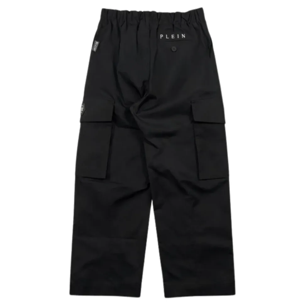 Philipp Plein cargo-bukser med vide ben kombinerer en afslappet silhuet med flere lommer til hverdagsbrug. Bukserne skiller sig ud med deres cargodetaljer og logomærke, hvilket giver funktionel stil til afslappede outfits. Vigtige egenskaber: Sort | Bomuld | Knap- og lynlåslukning | Elastisk talje bagpå | To påsyede cargolommer | To sidelommer | En baglomme | Cargostyling | Logomærke | Påsyede lommedetaljer | Dimensioner og pasform: Almindelig talje med elastik bagpå | Vide ben | Sammensætning og pleje: 97% bomuld, 3% elastan