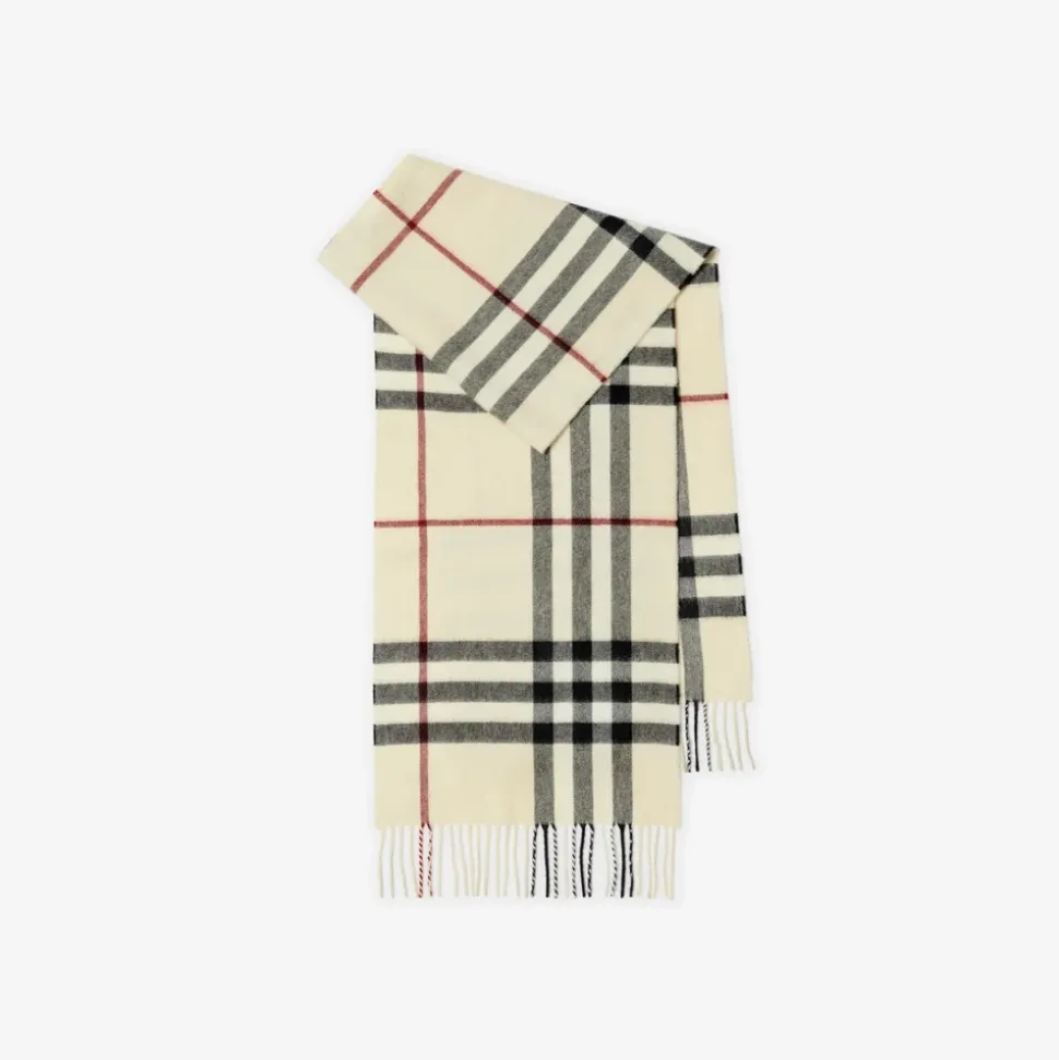 Burberry Cashmere Scarf i et langt design med frynser og brandets signatur, det gigantiske tern – et blødt, let tilbehør, der giver ekstra varme på kølige dage. Vigtige egenskaber: Beige | Ecru | Cashmere | Blød fornemmelse | Isolerende varme | Langt snit | Frynsekanter | Gigantisk ternet motiv | Frynsekanter | Lang rektangulær form | Dimensioner og pasform: 168 cm x 30 cm | One size | Sammensætning og pleje: 100 % cashmere